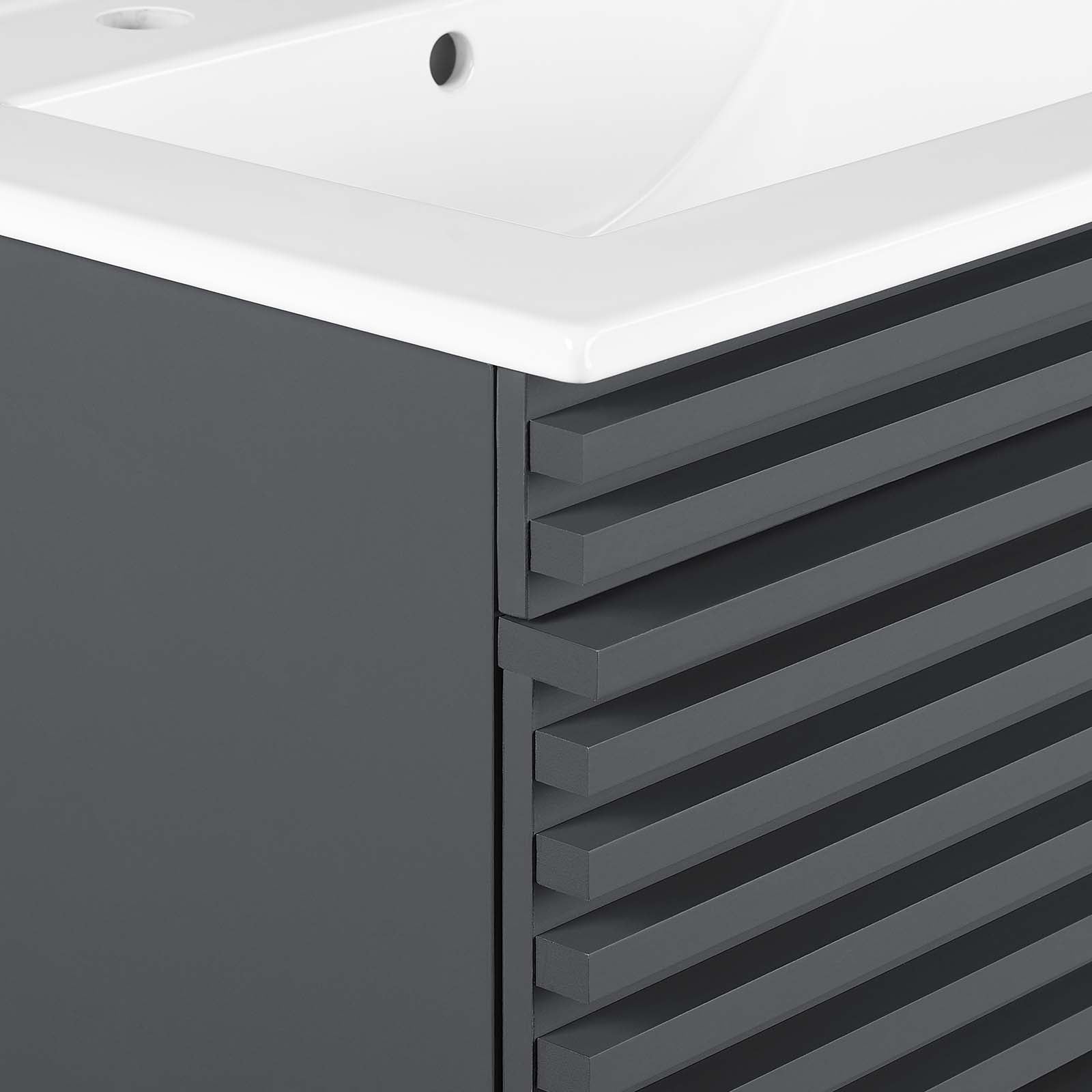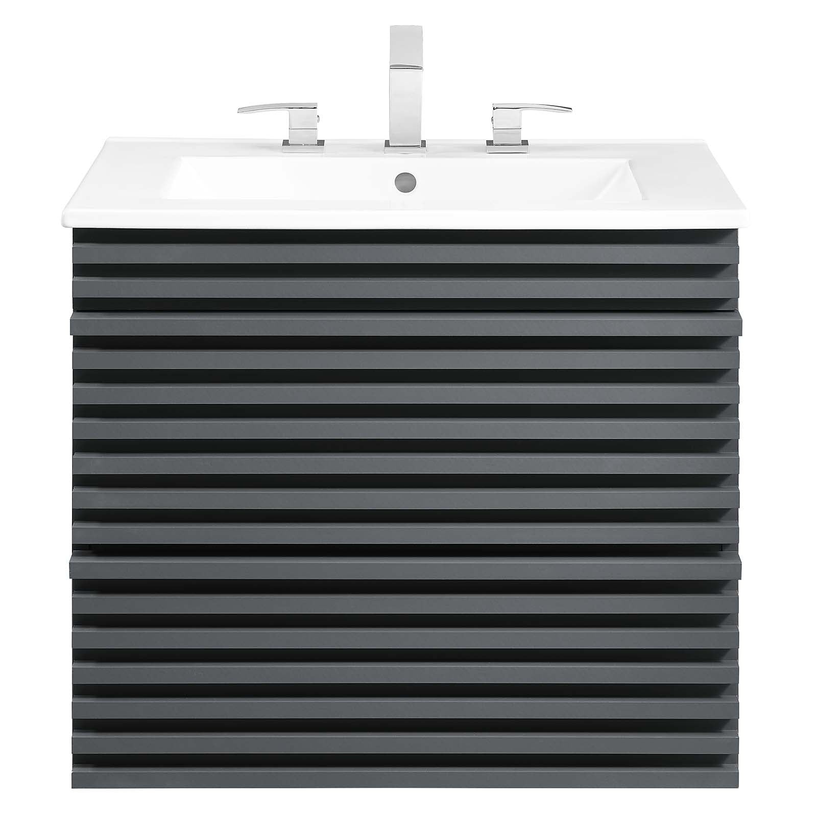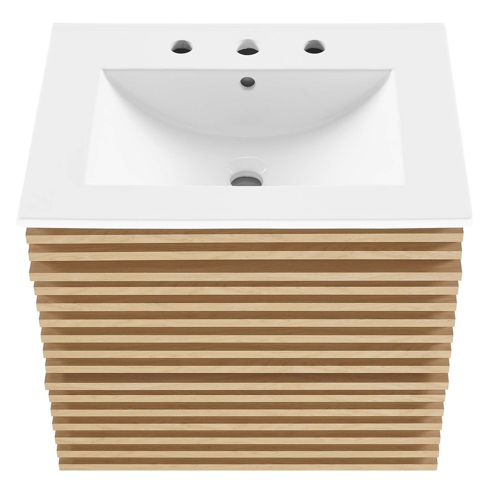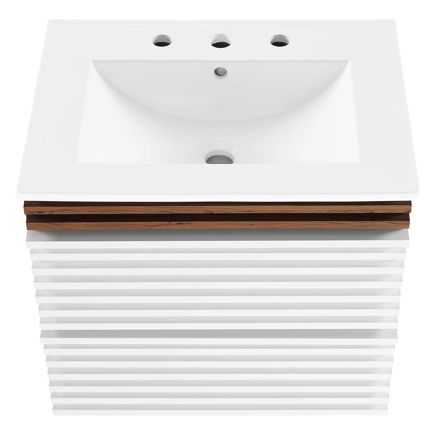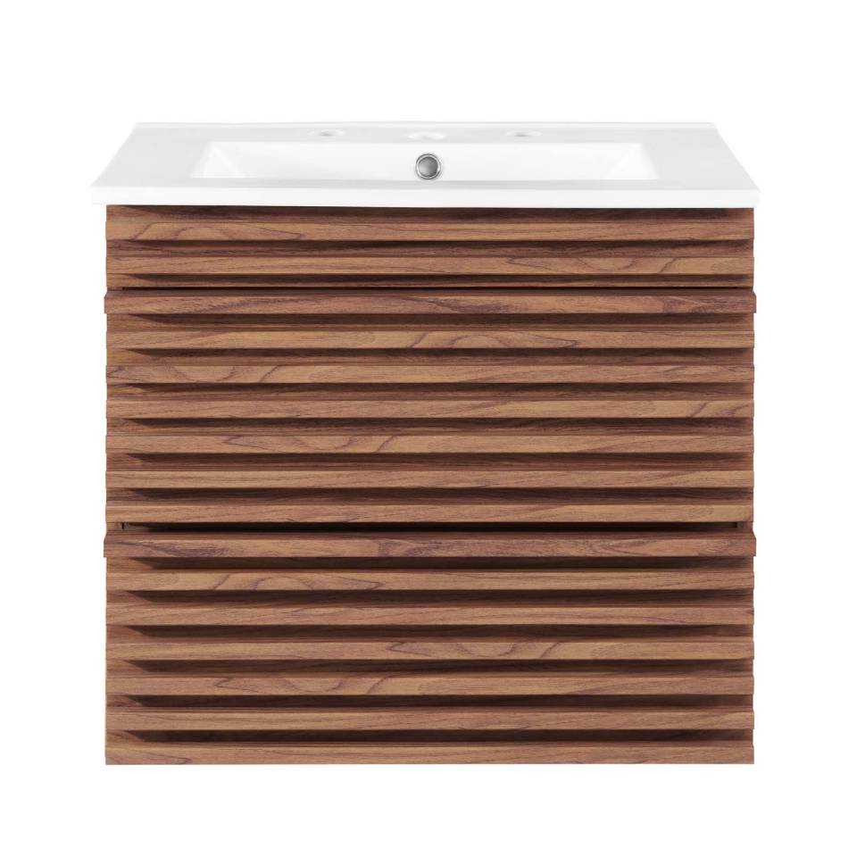 Tap into mid-century aesthetics with the Render Vanity. The Render 24" Bathroom Vanity features a durable MDF and particleboard frame with smooth walnut grain laminate, ample storage space in two full-extension drawers, and space-saving wall-mount design. Crafted with ceramic, a single sink with an integrated countertop, 8" centerset, and rectangular sink basin continue the sleek look of this retro modern vanity.