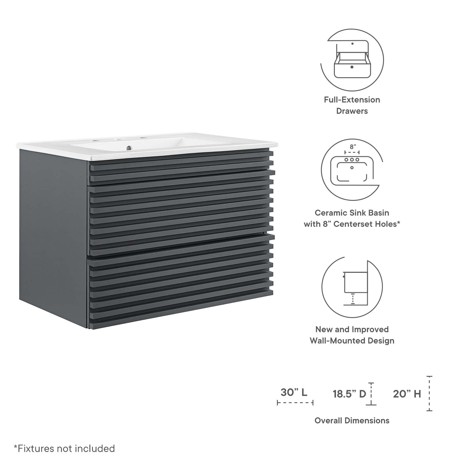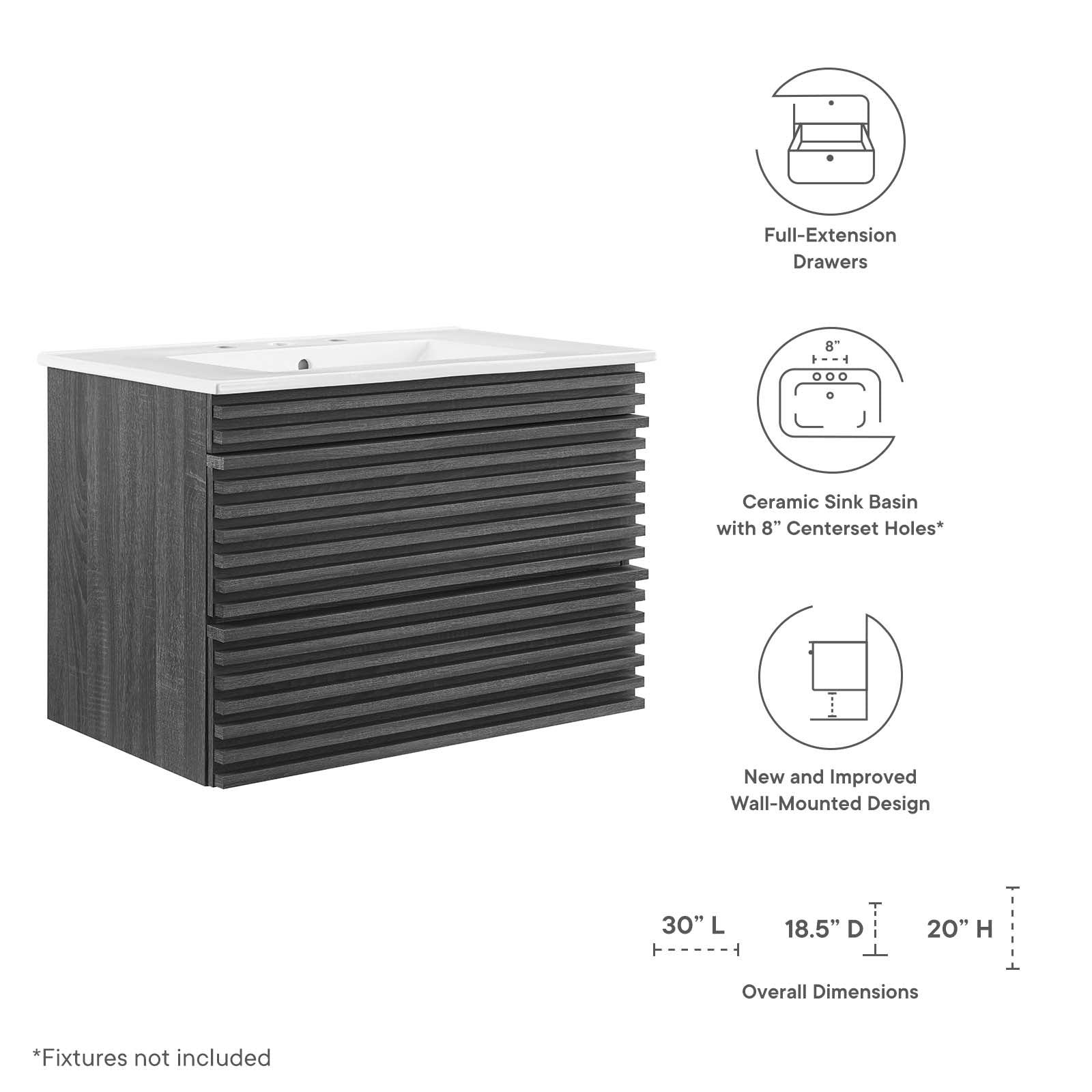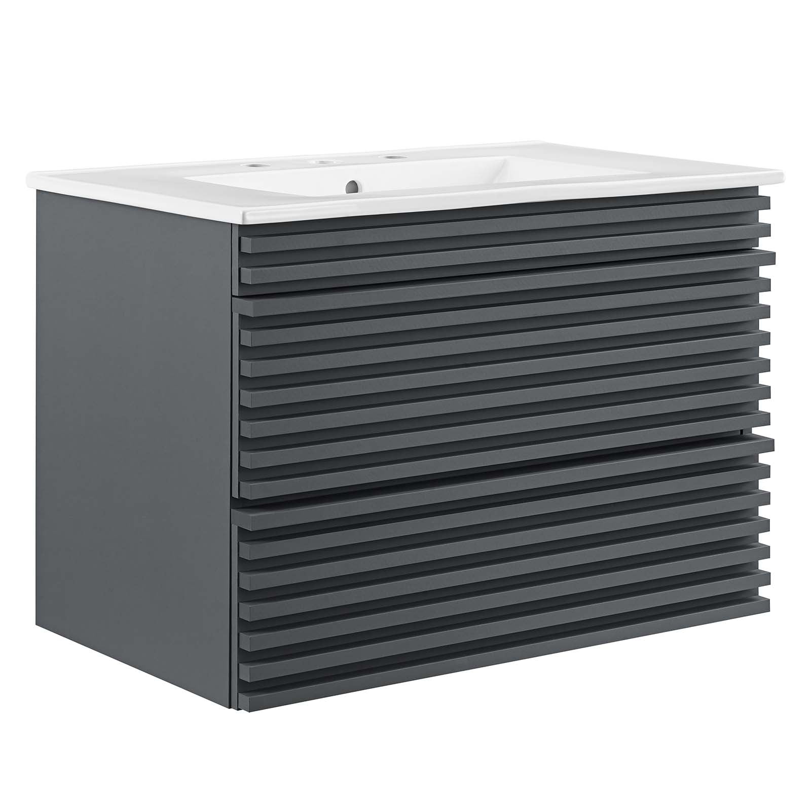 Tap into mid-century aesthetics with the Render Vanity. The Render 30" Bathroom Vanity features a durable MDF and particleboard frame with smooth walnut grain laminate, ample storage space in two full-extension drawers, and space-saving wall-mount design. Crafted with ceramic, a single sink with an integrated countertop, 8" centerset faucet holes, and rectangular sink basin continue the sleek look of this retro modern vanity. Clean lines and crisp design align for an edgy style designed to meet your needs. Boasting a mid-century modern style this vanity features a solid construction with a pleasing look and practical functionality.