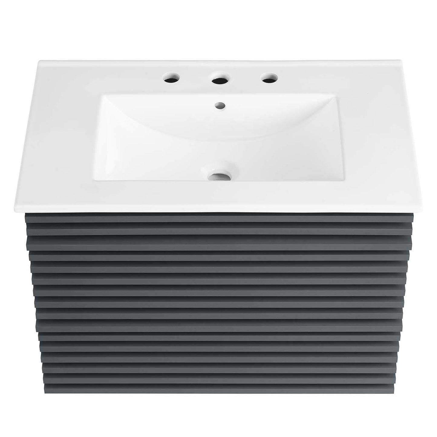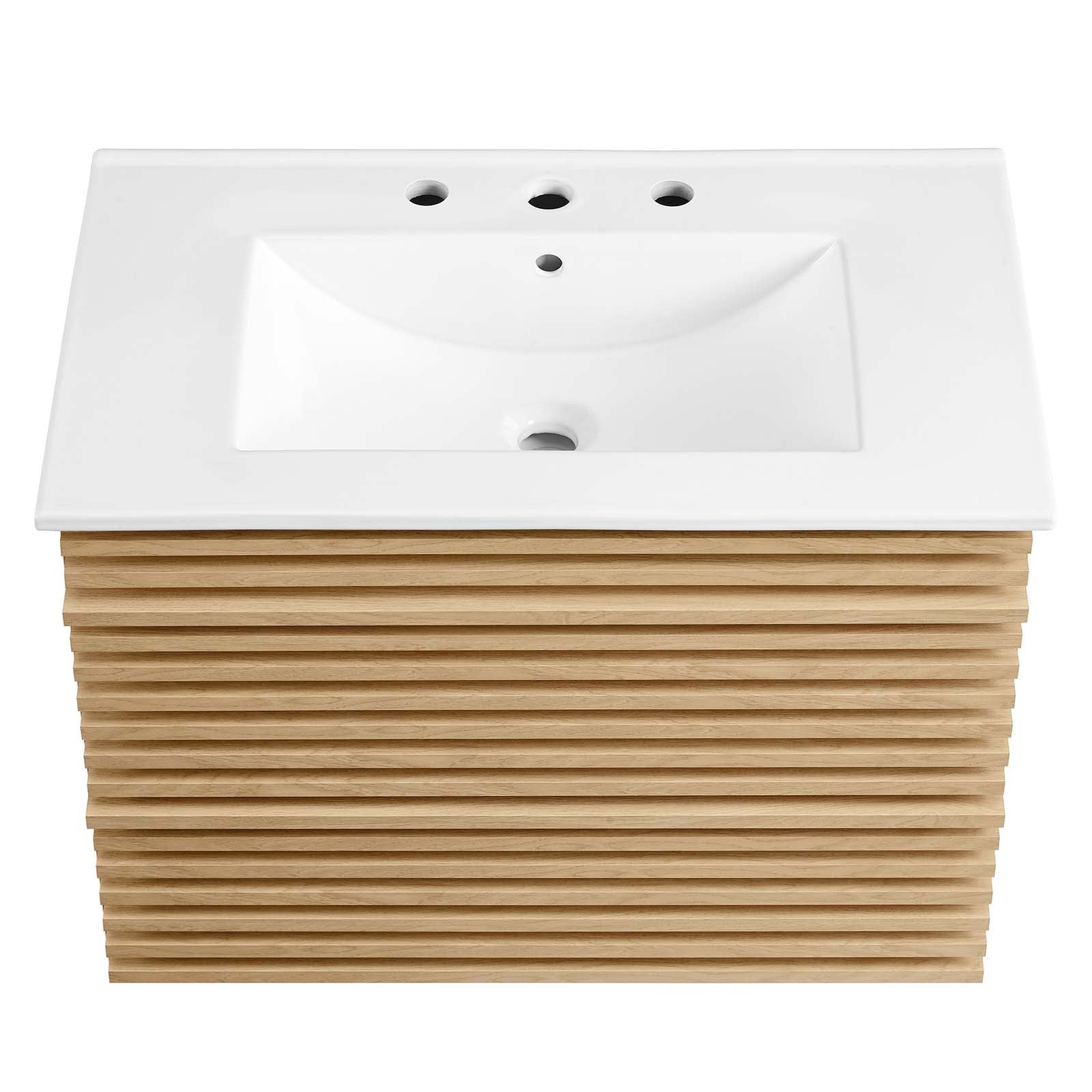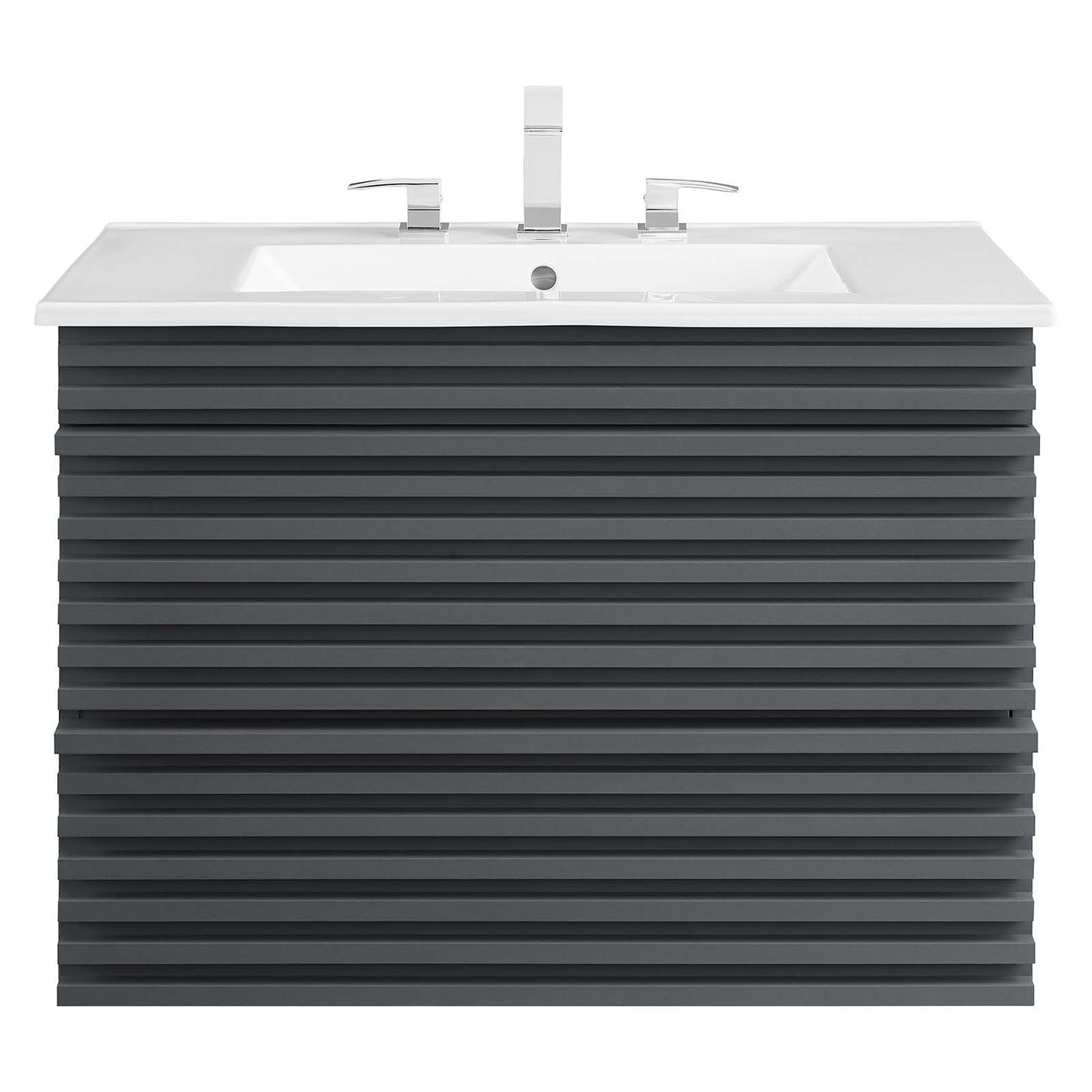 Tap into mid-century aesthetics with the Render Vanity. The Render 30" Bathroom Vanity features a durable MDF and particleboard frame with smooth walnut grain laminate, ample storage space in two full-extension drawers, and space-saving wall-mount design. Crafted with ceramic, a single sink with an integrated countertop, 8" centerset faucet holes, and rectangular sink basin continue the sleek look of this retro modern vanity. Clean lines and crisp design align for an edgy style designed to meet your needs. Boasting a mid-century modern style this vanity features a solid construction with a pleasing look and practical functionality.