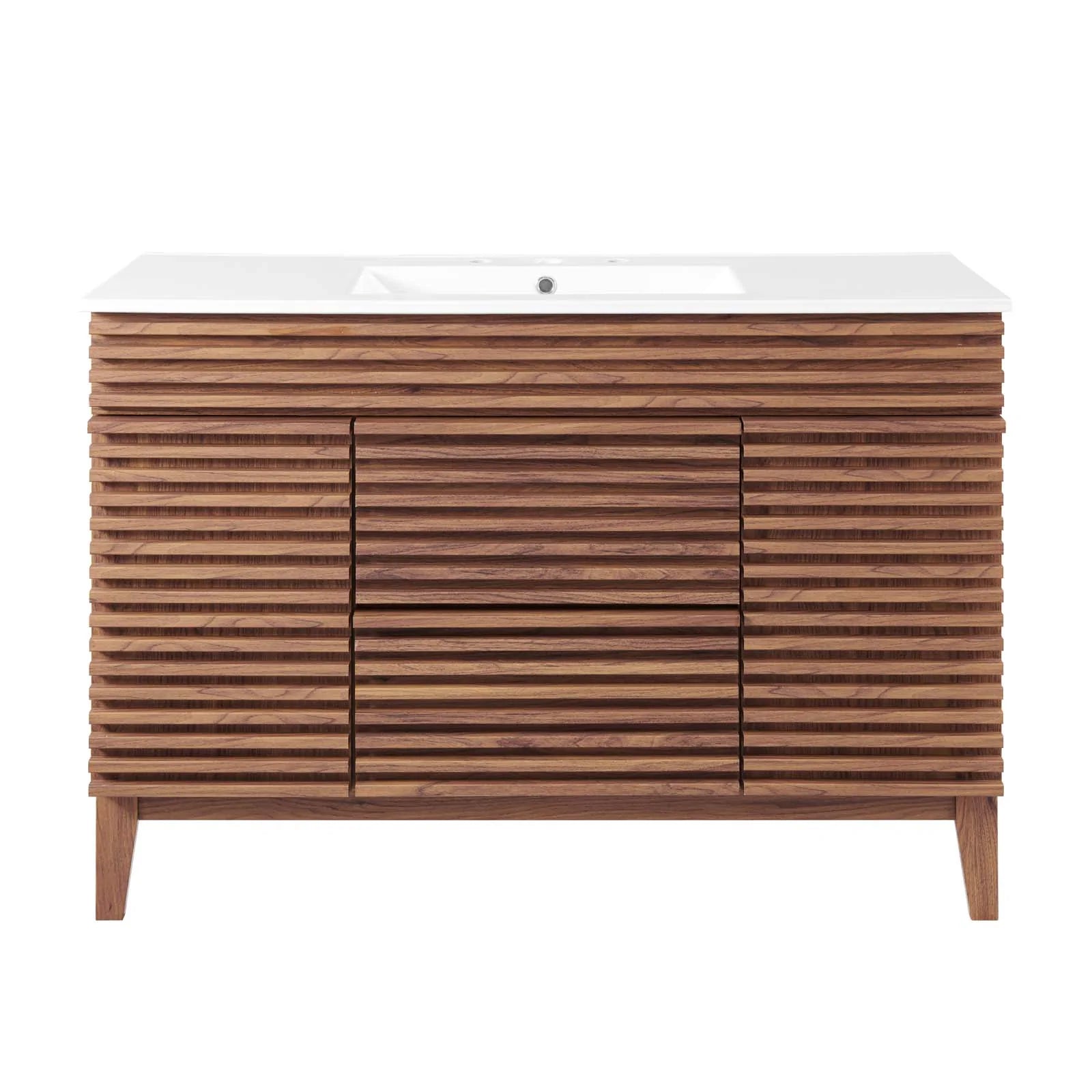 Tap into mid-century aesthetics with the Render Vanity. The Render 48" Bathroom Vanity features a durable MDF and particleboard frame with smooth walnut grain laminate, four tapered wood legs, and ample under sink storage space in full-extension drawers and behind soft-close hinged doors.