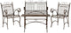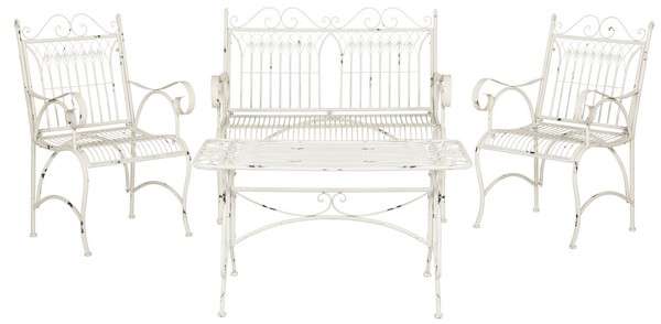 Dripping with turn of the century charm, this antique white four-piece outdoor set adapts handsomely to Craftsman, Art Nouveau or Victorian settings. Crafted of intricately-worked iron, this romantic set includes a love seat, two chairs and coffee table.