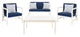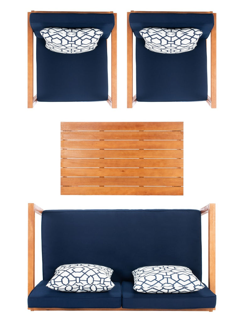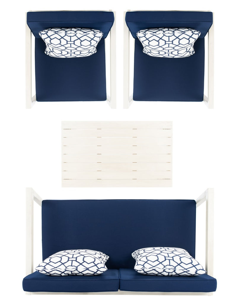Indulge in outdoor leisure living with this Montez Set. Perfectly styled for today‰۪s contemporary entertainment needs, the minimalist styled frames of Montez‰۪s loveseat, coffee table, and two armchairs emanate a chic modern air in a clean white finish, while plush navy cushions and trellis-patterned accent pillows make it luxurious.