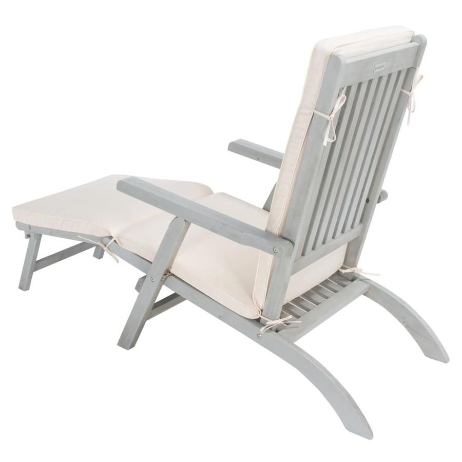 Inspired by ocean liner deck chairs, this inviting outdoor lounge chair exudes elegant relaxation. Crafted of sustainable acacia wood in a chic grey finish, this comfy lounge comes with an all weather beige cushion and square pillow with navy stripes.