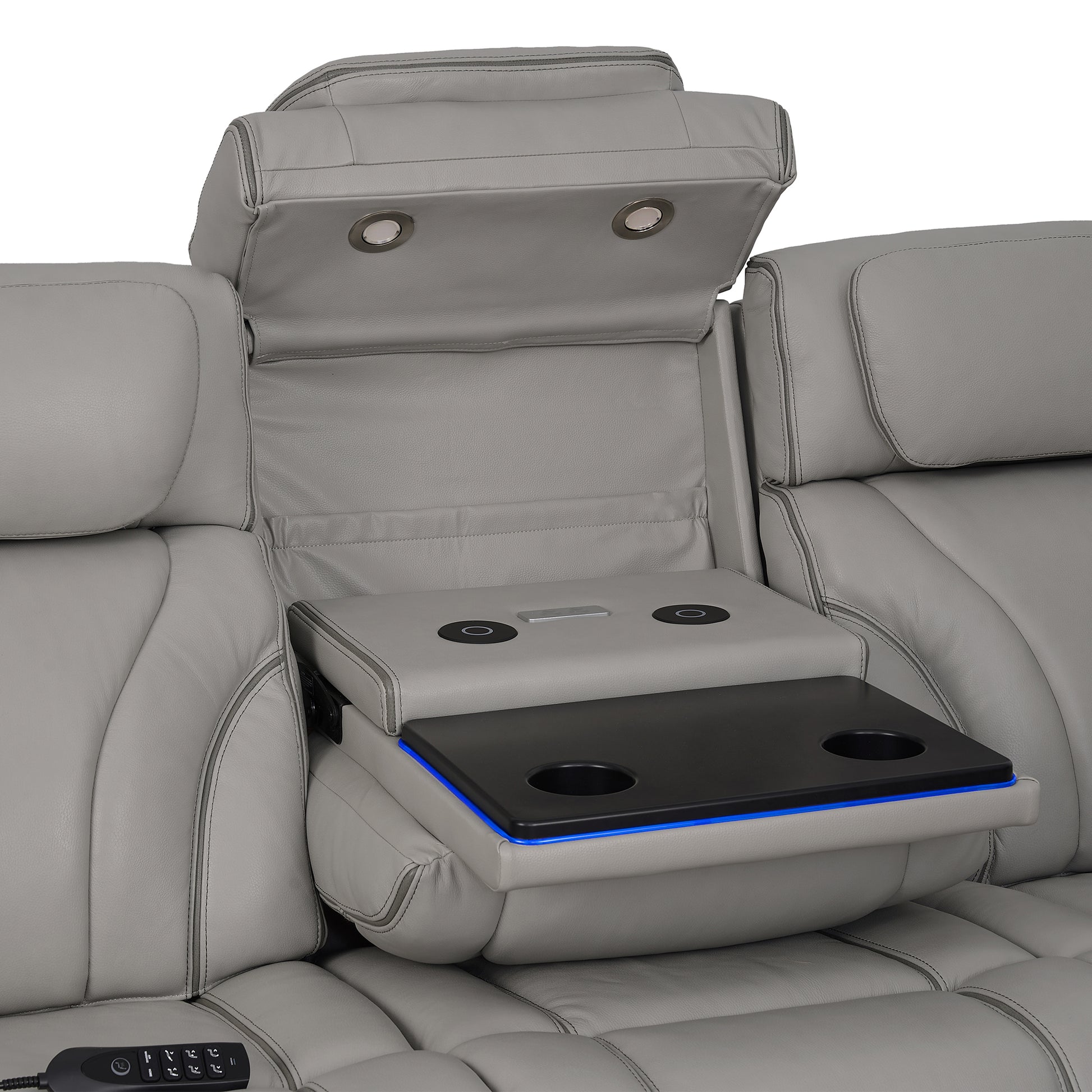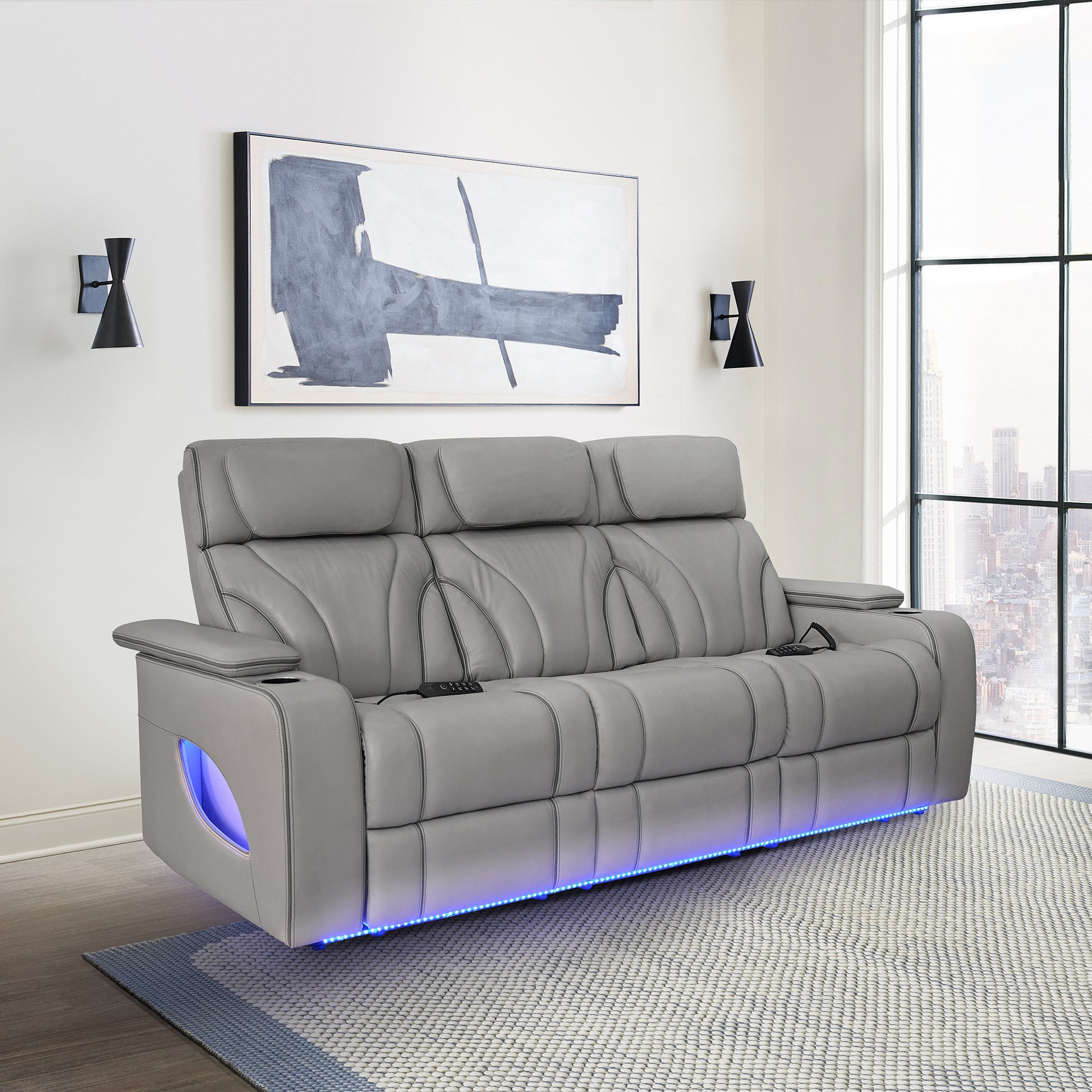 Transform your living room with the Octavia 86" Zero Gravity Power Reclining Sofa by Armen Living. This couch has everything: heating with an automatic shutoff, 3 modes of lumbar-focused air massage, power-raising headrest, electric reclining, a central drop down table, and so much more! The Octavia is a modern 3-seater sofa that is thoughtfully constructed with a sturdy steel and poplar wood frame, over 4.5-inches of high-density seat cushions, and durable leather match upholstery, meaning that all of the seats and arms you regularly touch are made with luxe top grain leather, while the sides and back utilize matching faux leather to maximize comfort and minimize maintenance. The central seat in this couch houses a high-tech console that opens to reveal a table lined with LED lights, two button-operated overhead reading lights, two wireless charging pads, and a pair of cupholders. The outer seats each come with a corded remote wand with its own USB port that operates the reclining, 3-speed massage, and heating functions, as well as a home button that conveniently returns all functions to their off and closed state. Additionally, the ellipse cutouts on each side panel and the underside of this luxurious upholstered sofa are accented with soft blue LED lights to instantly add ambience to any room. The Octavia sofa was designed with stunning attention to detail, each arm is equipped with light-up cupholders and a plush armrest that slides forward to cover it while not in use, the adjustable headrests are extra-cushioned and allow you to enjoy any activity with ease, and the zero gravity reclining is achieves a neutral body position that positions your legs above your heart to promote blood circulation and relieve joint and muscle pain. The Octavia Power Reclining Sofa is not just a piece of furniture, it's a modern oasis that brings the comfort of a movie theater into your home.