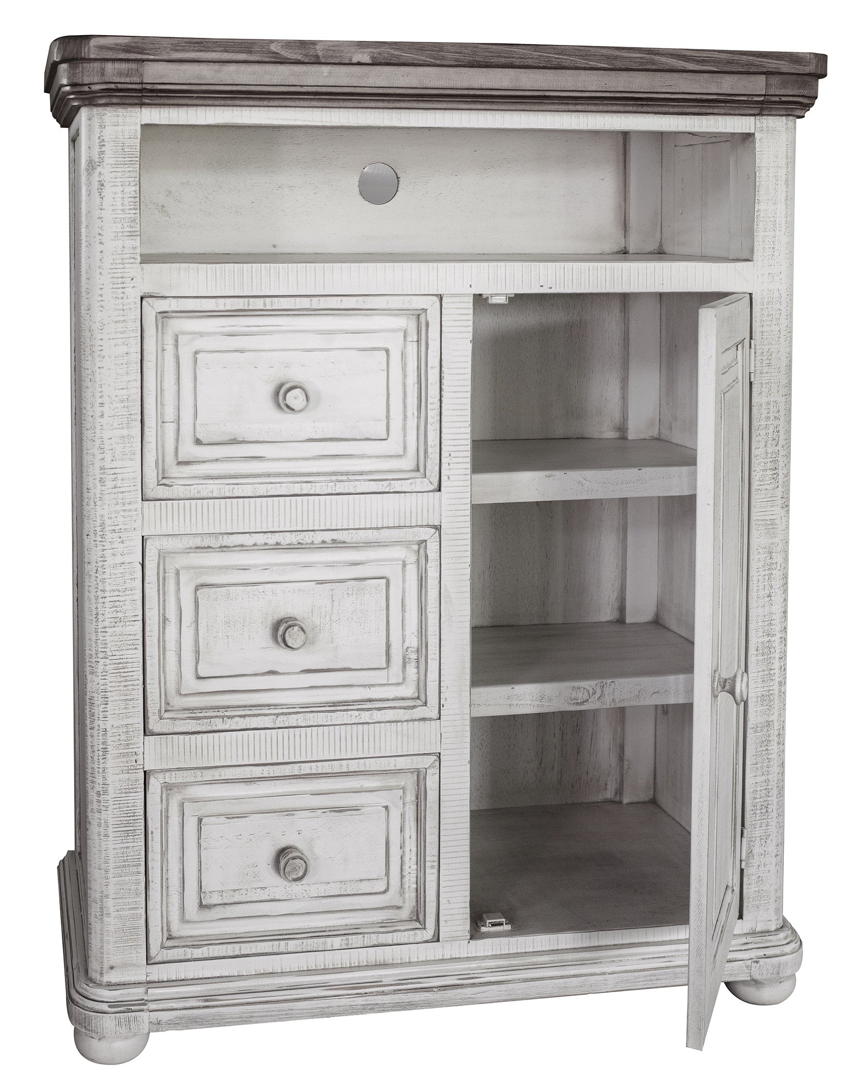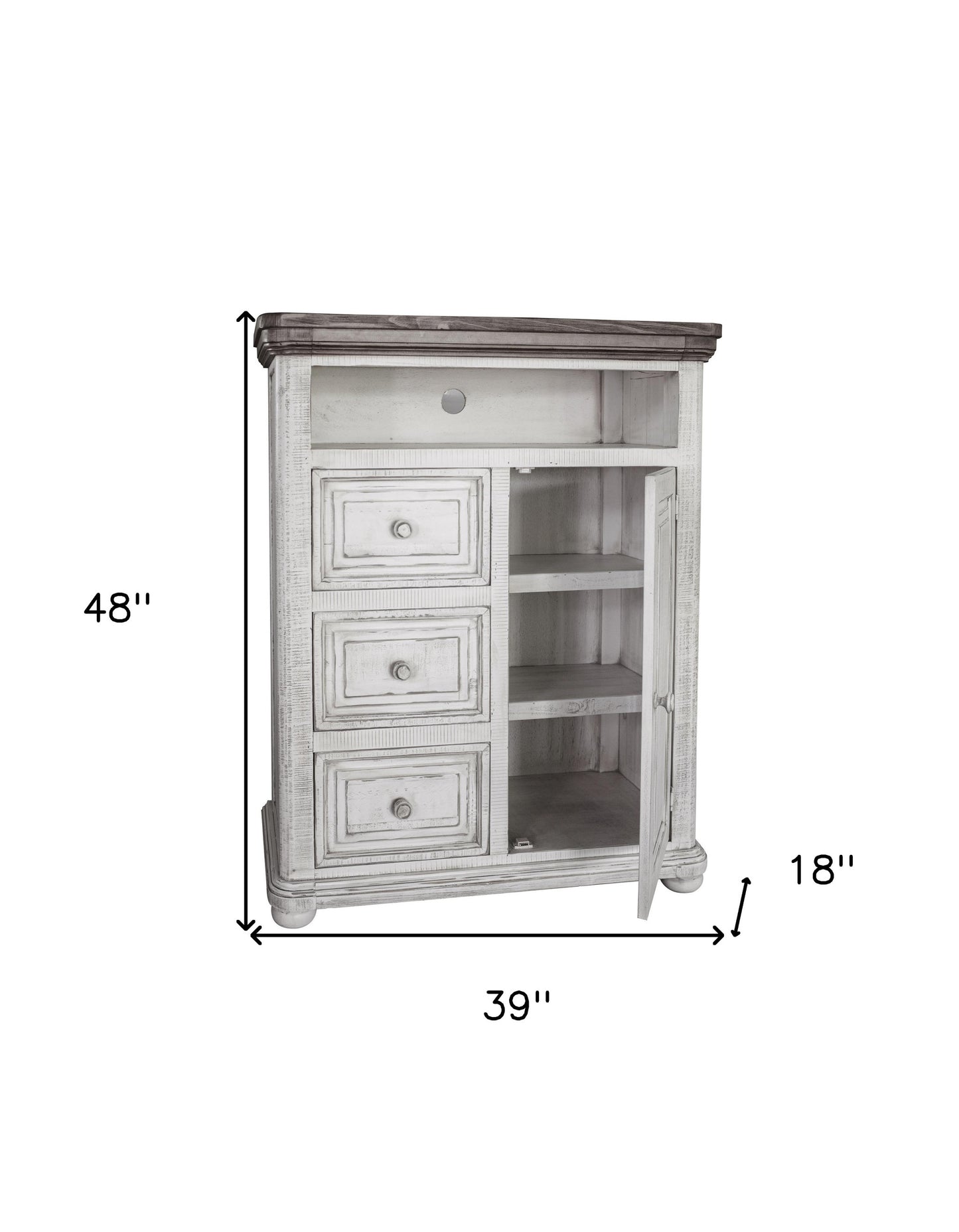 Make your room functional and visually enticing with this masterful 39" off white solid wood three drawer gentlemans chest. The space saving design of this gentlemans chest makes it a great choice for space challenged spaces or small walls within your room. Equipped with three easy open drawers for practical and good looking clothing storage. This dresser is built to last from high quality solid wood,. 48" H x 39" W x 18" D