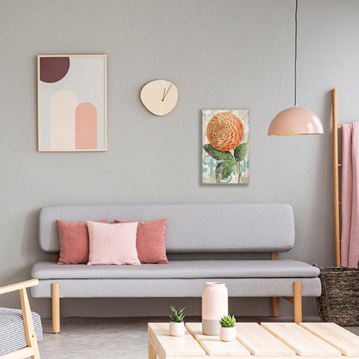 This oversized graphic Orange Zinnia Flower Wall Art is unique and refreshing for your space. This solo flower design with a slight French flair is printed directly onto distressed wood panels that include knots and other imperfections to enhance the vintage look and feel of this casually elegant piece. The distressed and faded colors make this vintage style botanical wall art a beautiful addition to any kitchen, living room, bedroom, or entrance way. 15" x 26" x 2".