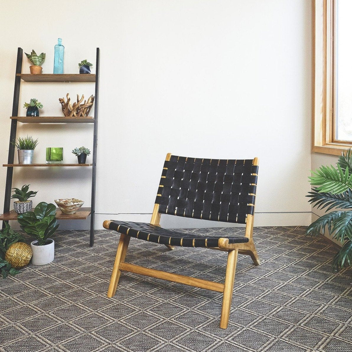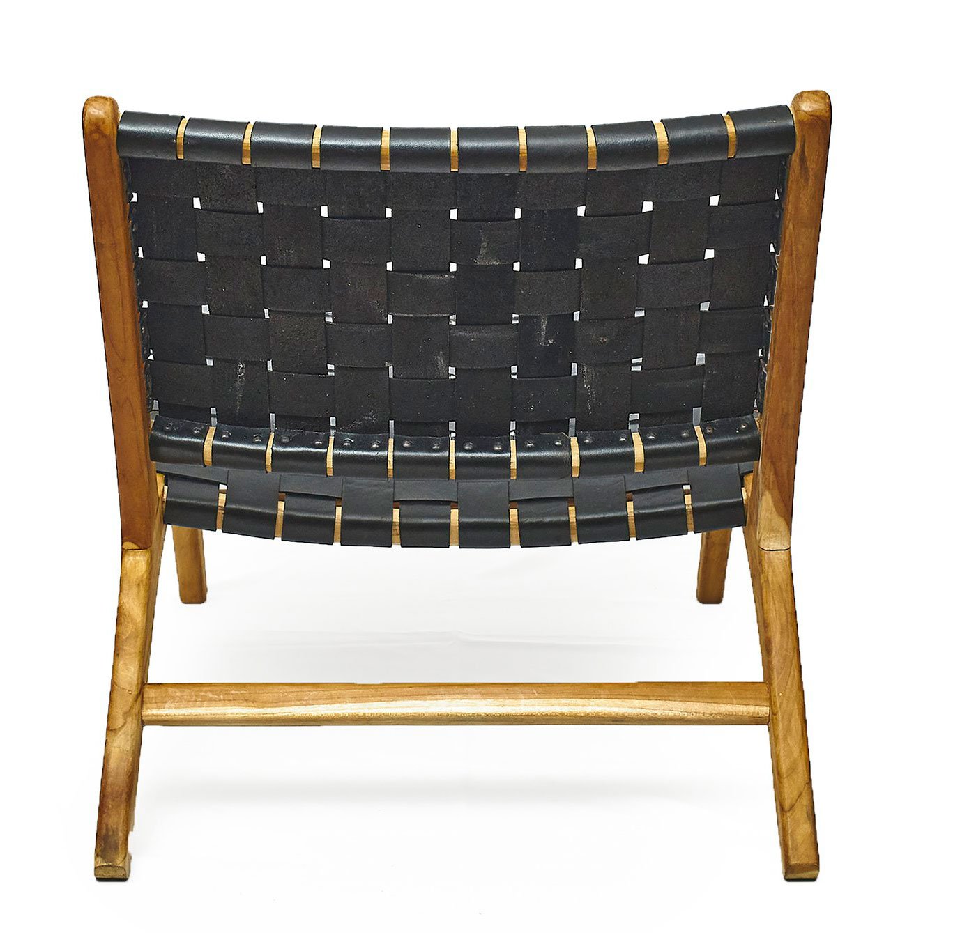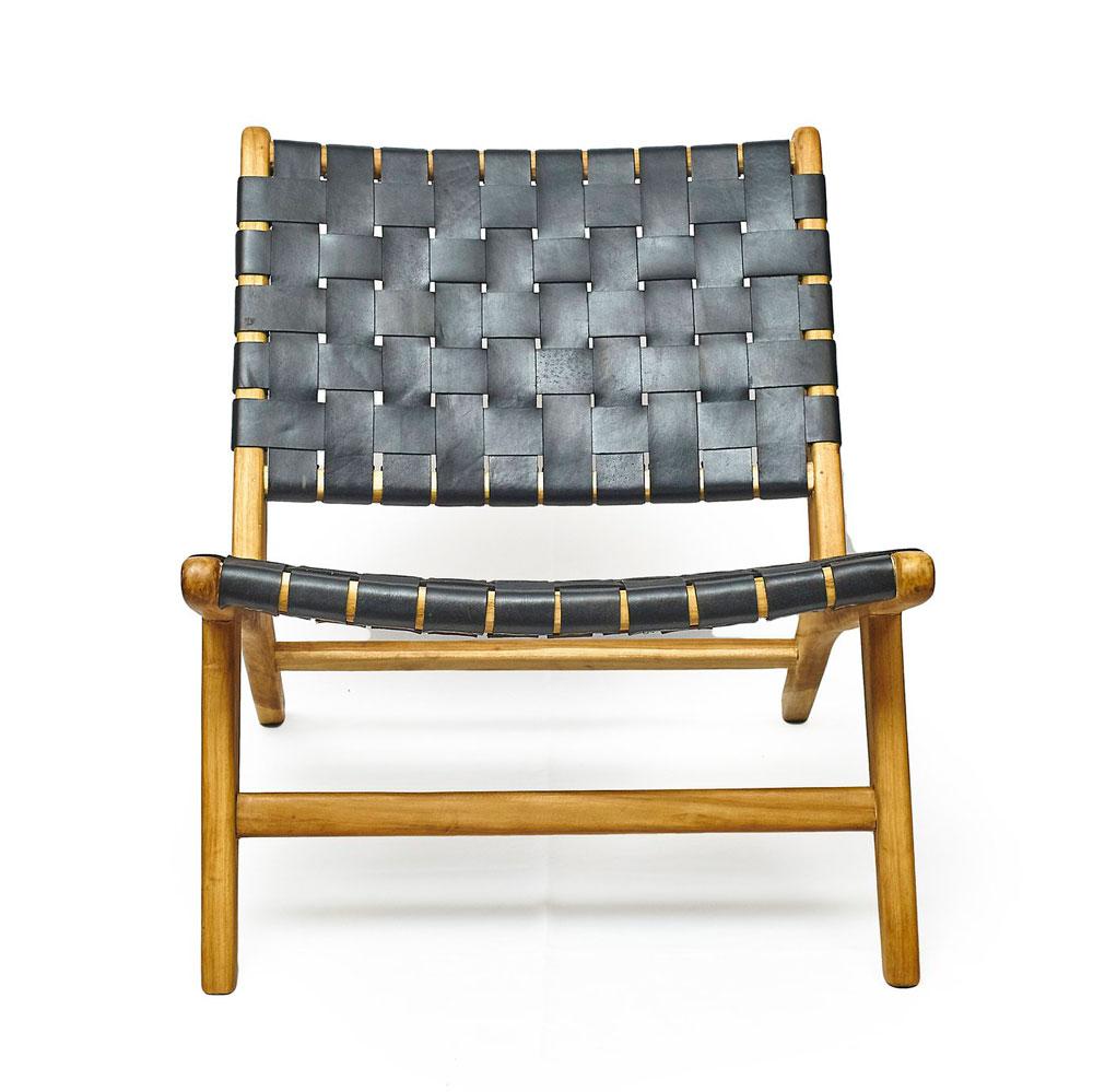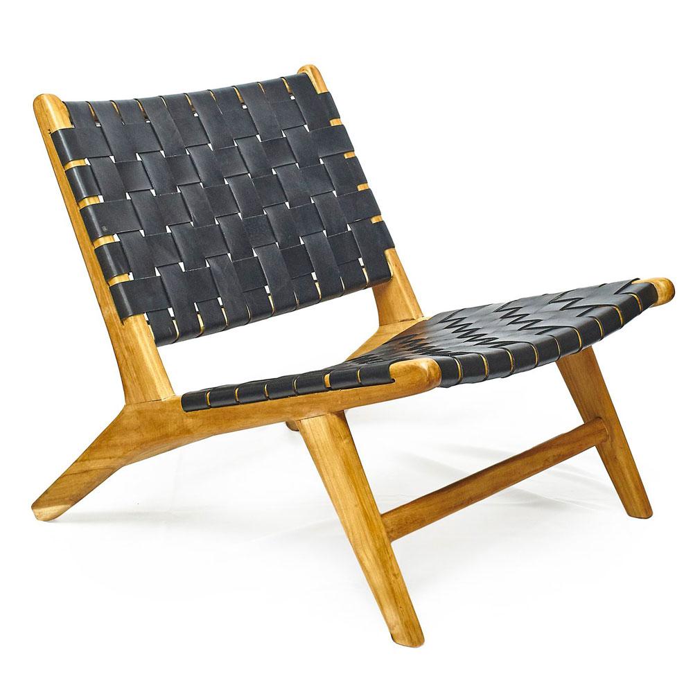 The ebony coloured leather lounge chair is perfect for easy and restful seating.Leather straps are woven onto a golden brown teak wood frame and secured with dark iron rivets.