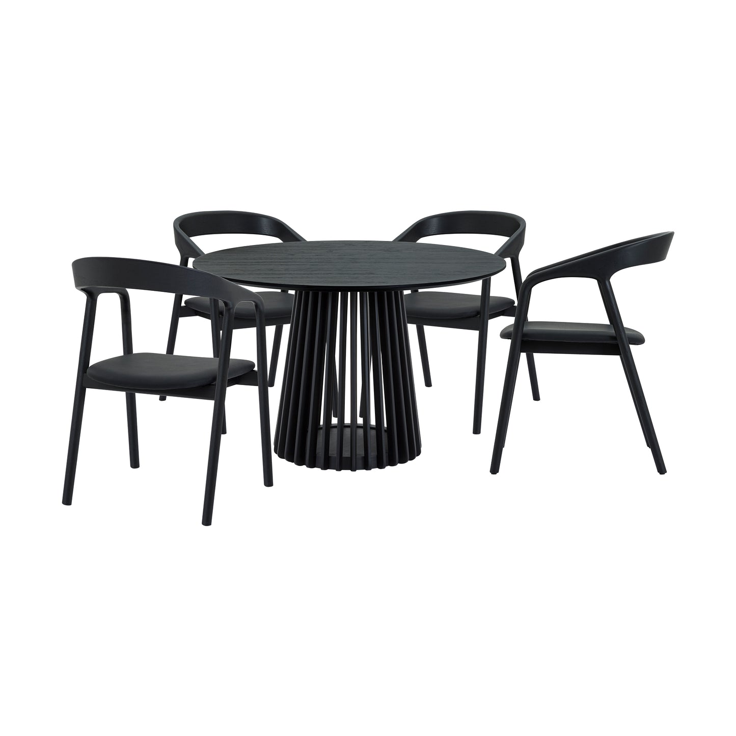 Introducing the Pasadena Apache 5 Piece Round Dining Set. This set includes the 1 Pasadena round dining table and 4 Apache dining chairs. Crafted with meticulous attention to detail, the round shape of the table brings a touch of sophistication, creating a dynamic focal point for gatherings in your dining room. The compact 47-inch size makes it an ideal choice for those seeking a small dining table without compromising on style. Its versatility extends beyond the dining room, seamlessly integrating into kitchens as a modern kitchen table. The Apache chairs showcase a sophisticated blend of Black Oak Wood and Faux Leather, creating a sleek and timeless aesthetic. The upholstered dining chair design provides both comfort and style. Their contemporary design ensures they seamlessly integrate into various interior styles, elevating the ambiance of any space. The versatility of these chairs extends beyond the dining room; they make for stylish additions such as vanity chairs or accent pieces, enhancing the aesthetic appeal of any room. The retro allure of mid-century design is present in the slatted paneling on the column structure of the pedestal base, further elevating its appeal, whilst lending its unmistakable character and attractive, architectural-like quality. This 5-piece dining set comes complete with the Apache Black Oak Wood and Faux Leather Dining Chairs and one of 3 different color variations for the Pasadena table. This exquisite oval dining table is available in an all-black oak finish, an all-natural oak finish, or a walnut tabletop finish with a black base to suit any room.
