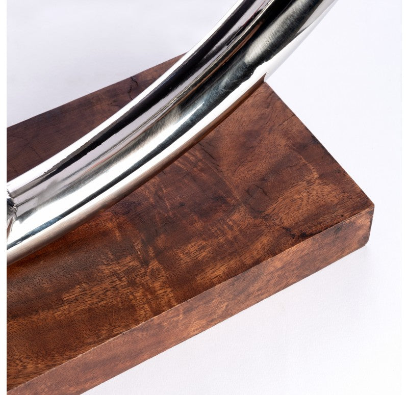 Handcrafted Polished Stainless Steel. If Sculpture Becomes Loose From The Acacia Wood Base During Transportation, Simply Tighten The Bolts Underneath. Indoor Only. Truck Shipping. Weight: 10.7 Lbs.