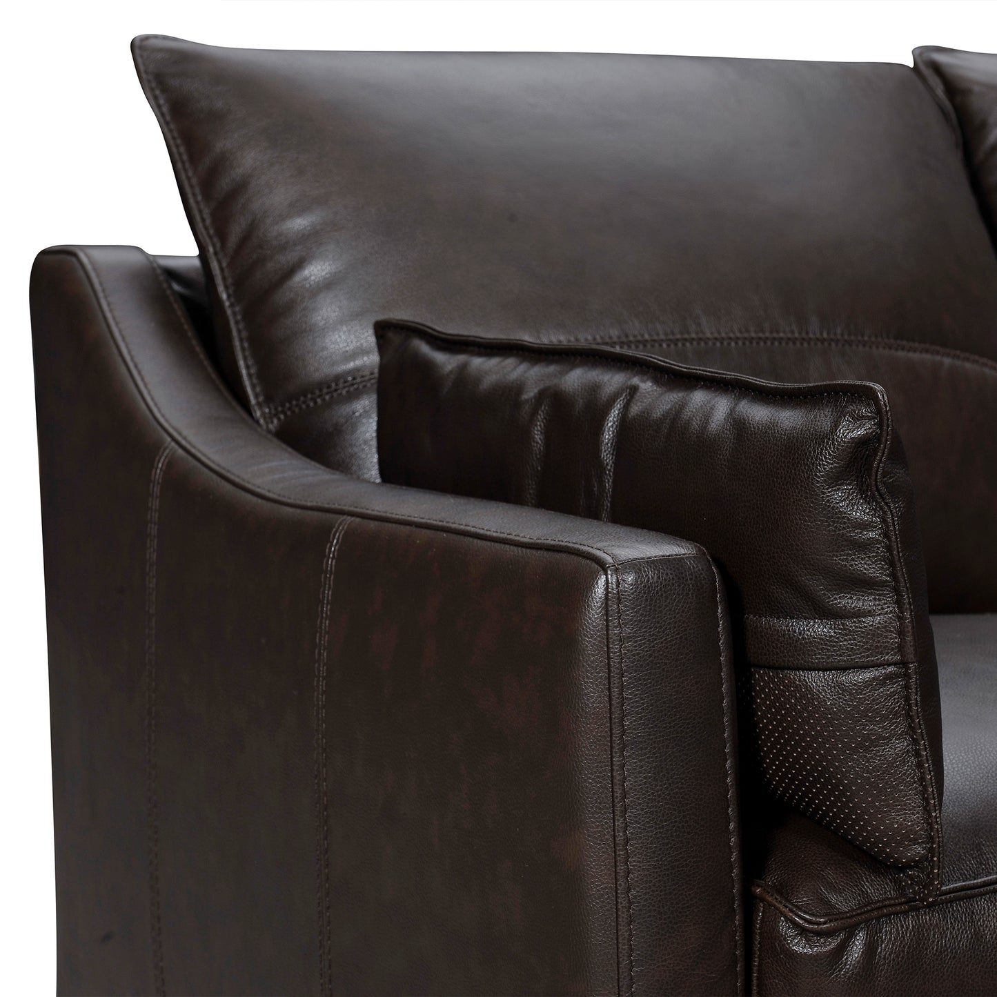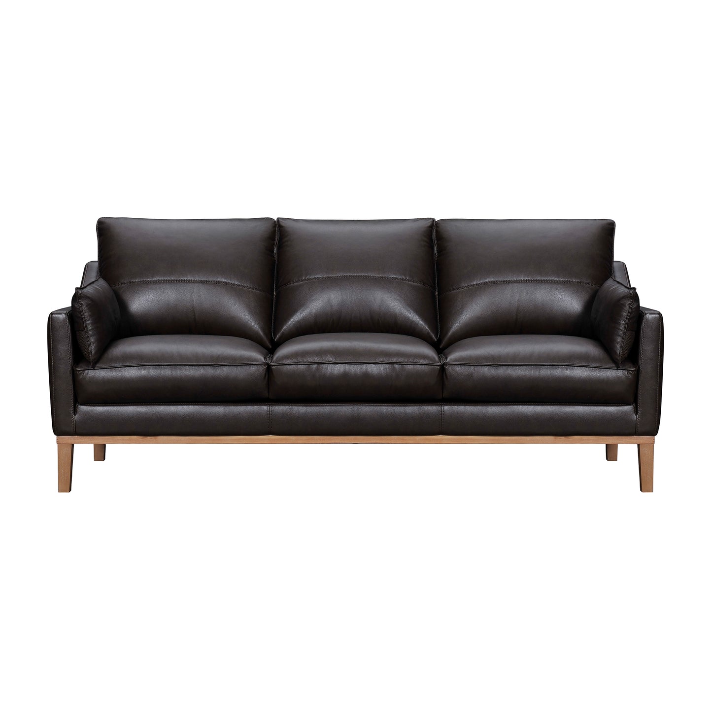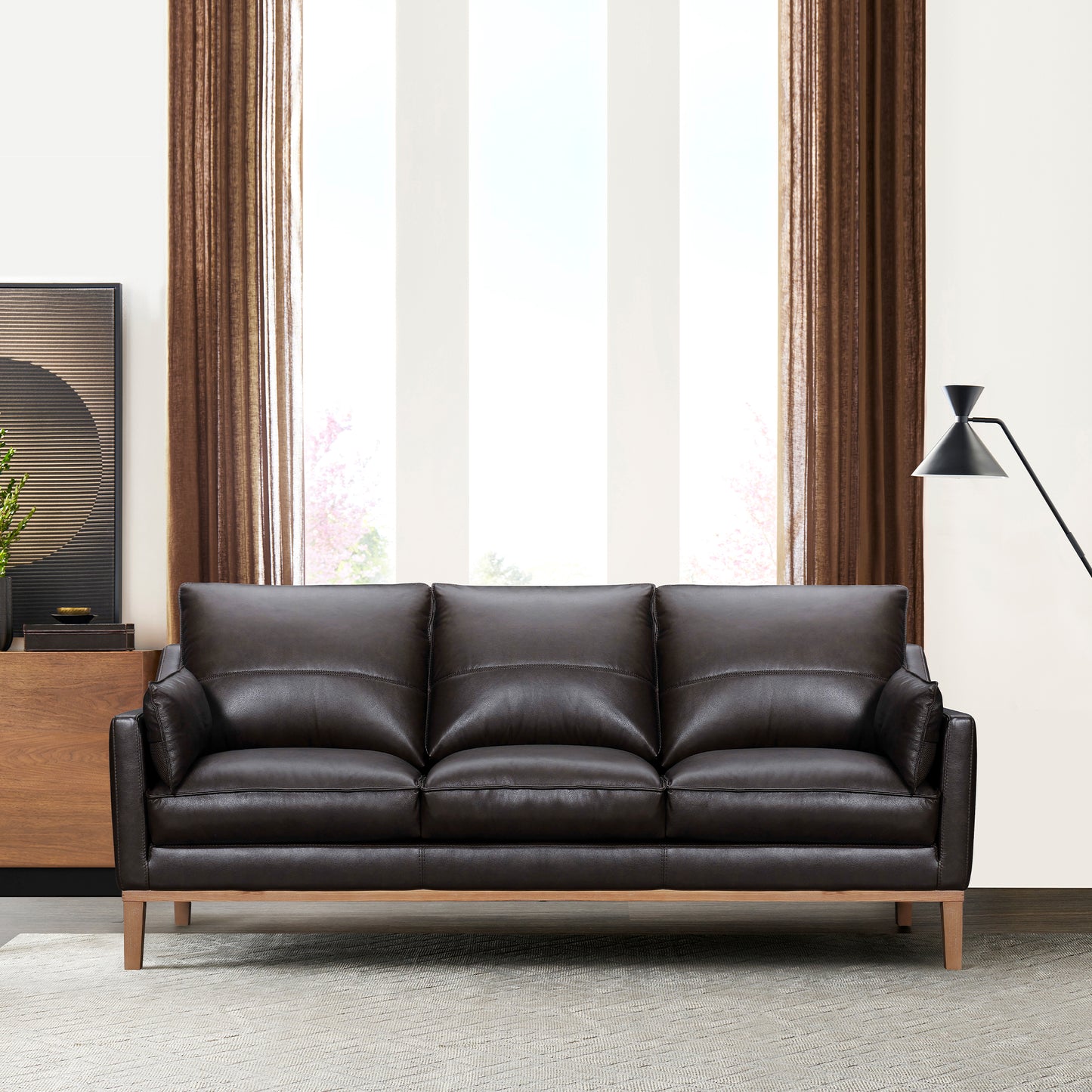 Upgrade your living space with the Pompeii 87" Leather Upholstered Sofa from Armen Living. This exquisite sofa offers a blend of luxury and comfort that's hard to match. This couch features rich leather upholstery available in elegant dove gray or timeless dark brown. This leather not only adds a touch of opulence but also ensures durability that lasts. With a spacious 87-inch-wide frame, the Pompeii comfortably seats up to three guests. Whether you're hosting friends or enjoying a quiet evening in, this sofa offers ample room for everyone to unwind. Our grey or brown leather sofa is supported by a sturdy wood base and legs that enhance its stability and offer a contrast of textures. Designed for optimal comfort, the Pompeii brown or grey sofa features web suspension seat construction. This innovative system ensures even support throughout the seating area, reducing pressure points and maintaining comfort over time. The chic silhouette, deep seating design, and premium materials make our Pompeii leather sofa the ideal seating solution for your home.