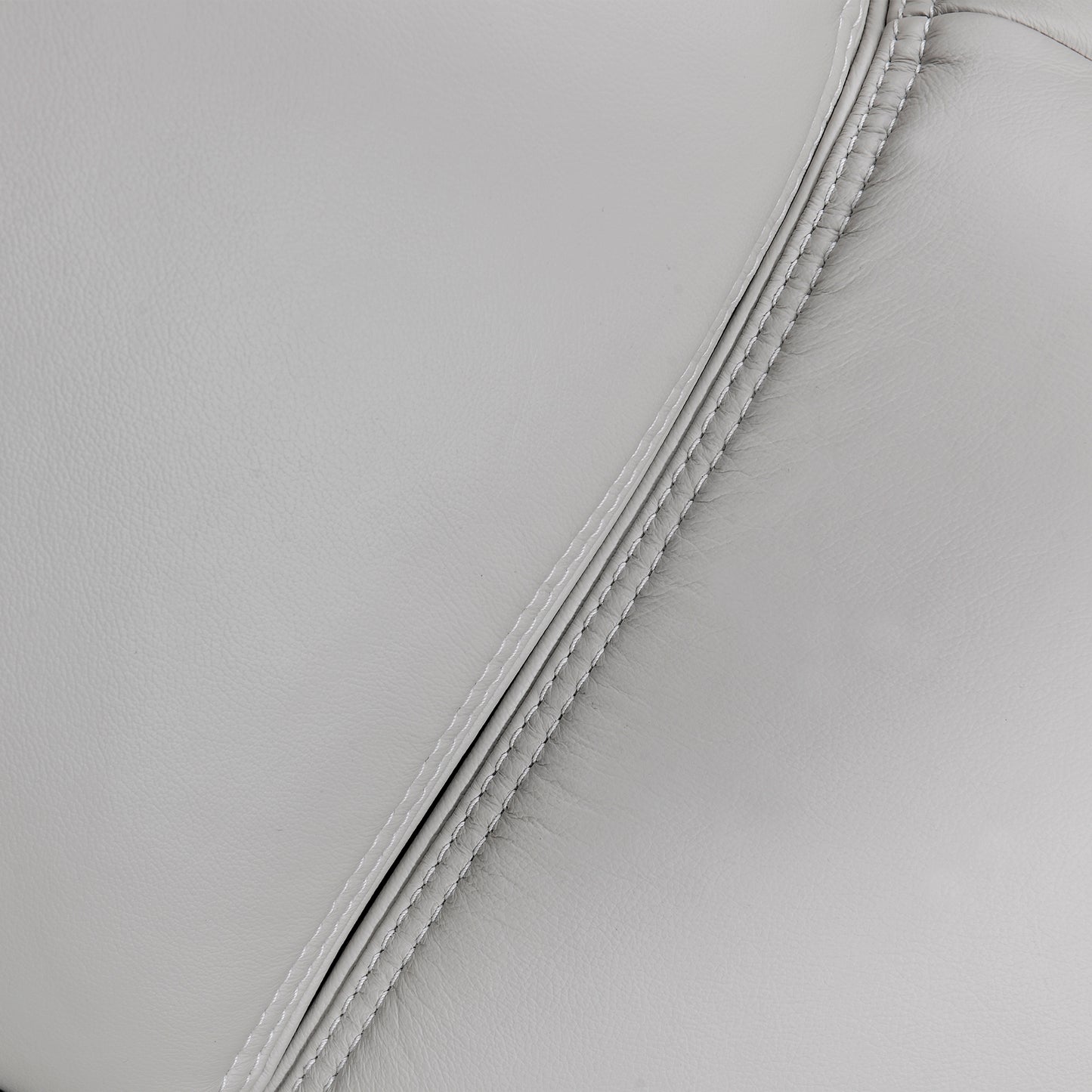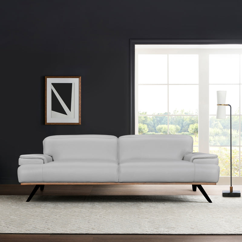 Modern and luxurious, the Prato 89" Dove Gray Leather Sofa is a perfect addition to your home. This 89” sofa easily accommodates up to 3, it’s strong metal leg base offers support and contributes to its stylish aesthetic. The Prato features 2 manually adjustable headrests for additional support. The soft leather upholstery, high density foam, and sinuous spring seat construction enhance the comfort level. This leather upholstered couch is ideal for curling up with a good book, enjoying your favorite form of entertainment, or taking a mid-day nap. The durable leather upholstery exudes durability and luxury. Not only is leather easier to care for than other upholstery fabrics, but its hypoallergenic properties also make it less likely to harbor pollen, pet dander, dust mites, and allergens. With a sleek profile, this sofa can upgrade your home or apartment with ease. Featuring beautiful dove grey leather upholstery and a sleek black metal leg base, the Prato sofa will offer comfort, convenience, and style for many years to come.