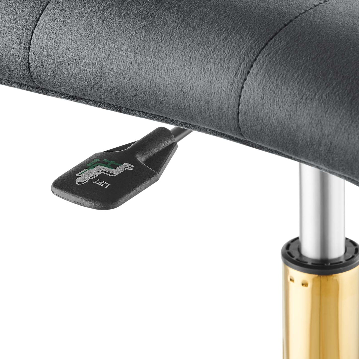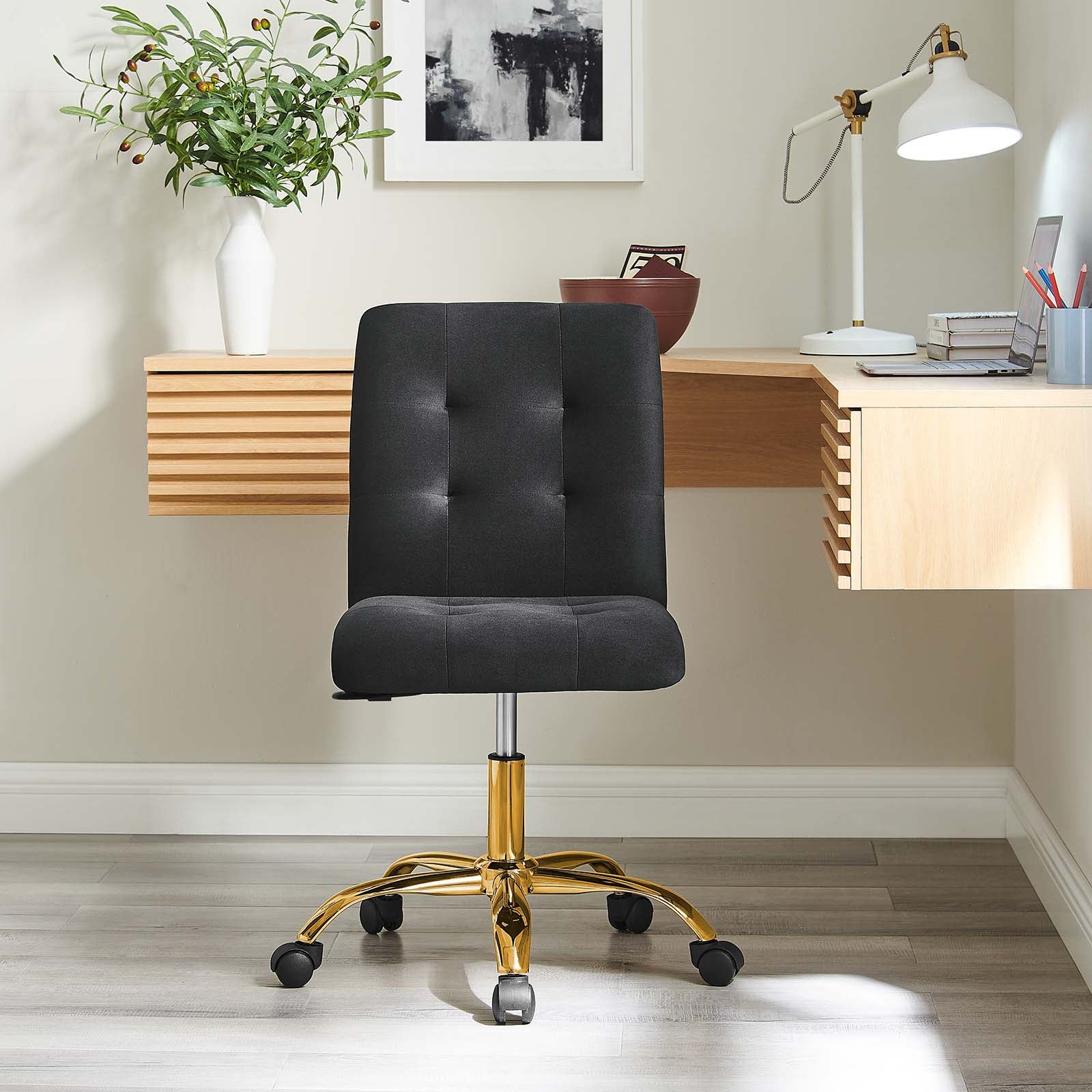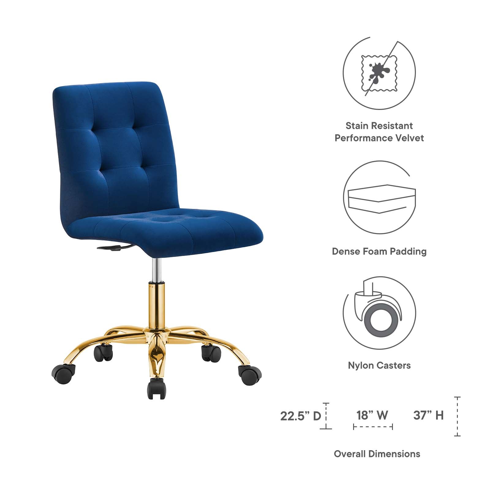 Etiquette presides over the properly styled Prim Armless Office Chair. Modern and luxurious, this swivel office chair features deep biscuit tufting, stain-resistant performance velvet upholstery, and elegant piped trim for added finesse. This velvet office chair is height adjustable, features a 360º swivel, and comes outfitted with a gold metal base with five dual-wheel nylon casters. Perfect for conference rooms, workstations, desks, or college dorm rooms, Prim is complete with dense foam padding for lasting comfort throughout the workday. Assembly required. Weight Capacity: 287 lbs. Set Includes: One - Prim Armless Office Chair
