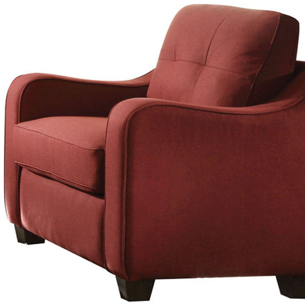 Luxuriate in the sumptuous texture and exquisite touch of our linen chair. The set offers an elegant platform for comfortable seating for the family. Featuring buttonless tufted backrest and seat, loose back and seat cushions, this beautiful piece comes in rich red linen fabric upholstery. Stylishly crafted with the armrest having a well-tailored welt trim, the chair is complemented by plastic block legs in dark oak finish.