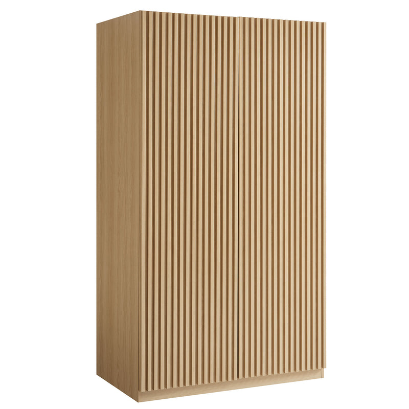 Tap into mid-century aesthetics with the Render Bedroom Wardrobe. This 2 door wardrobe with adjustable shelves features a durable particleboard frame with smooth wood grain laminate and vertical slatted detail all the way down the doors for a sleek, stunning look. The wardrobe armoire closet includes a spacious storage area behind soft-close doors, complete with two sturdy metal clothing bars and adjustable shelves for customizable storage space. This versatile 71 inch wardrobe cabinet with hanging rods provides ample room for organizing folded and hanging clothes, linens, and more. Perfect as a tall storage cabinet for bedroom or living room, this modern wardrobe with vertical slatted doors combines style and functionality. The Render Freestanding Closet boasts a solid construction, making it a practical addition to any room. Assembly required.