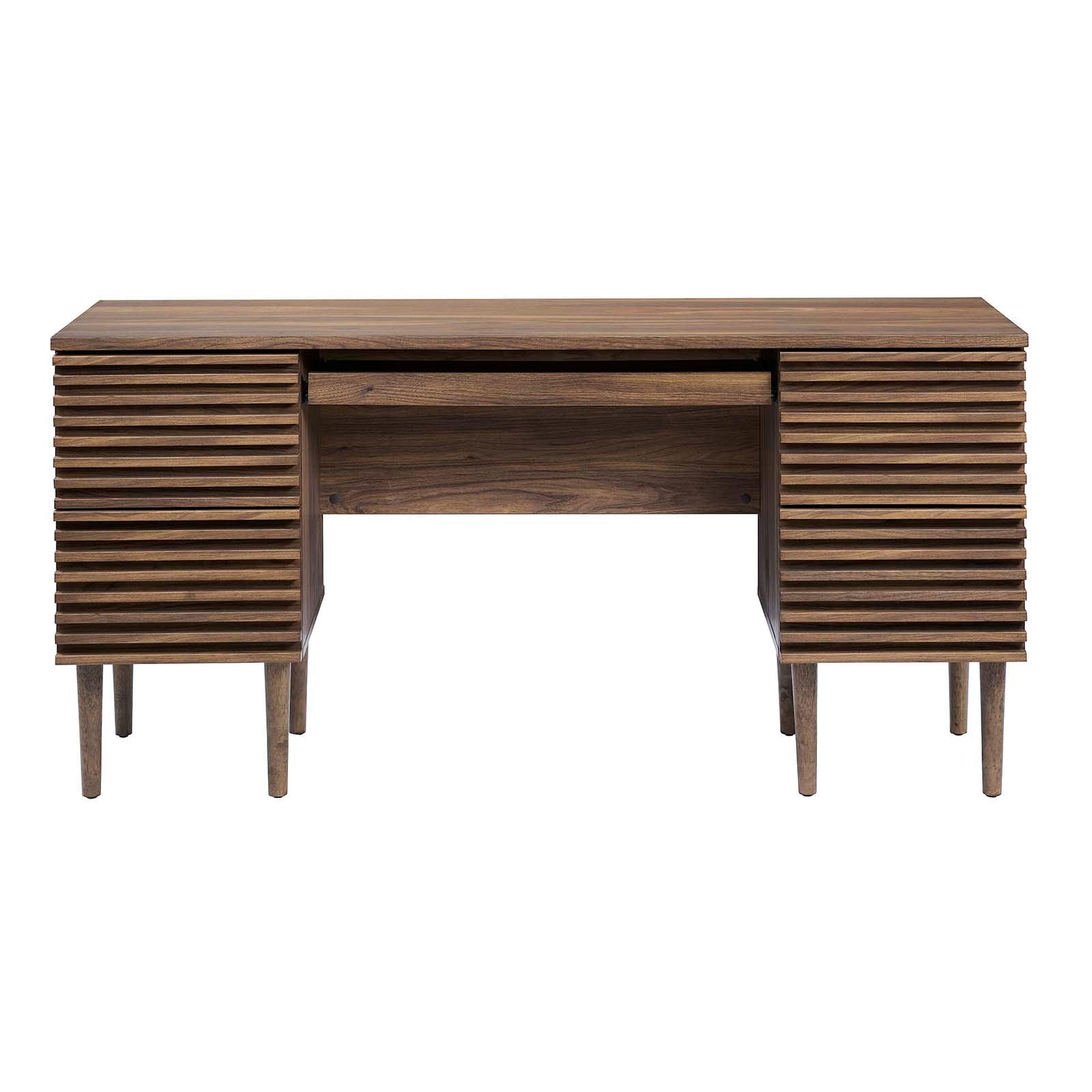 Tap into mid-century aesthetics with the Render Office Desk. This office desk features a durable particleboard frame with a smooth walnut grain laminate. A pull-out keyboard tray and four full-extension glide drawers offer ample storage space for all your office essentials. Boasting a mid-century modern style and resting on tapered wood legs, this computer desk features a solid construction with a pleasing look and practical functionality. Perfect for the apartment, home office, or dorm room. Includes non-marking foot pads. Assembly required. Set Includes: One - Render Office Desk