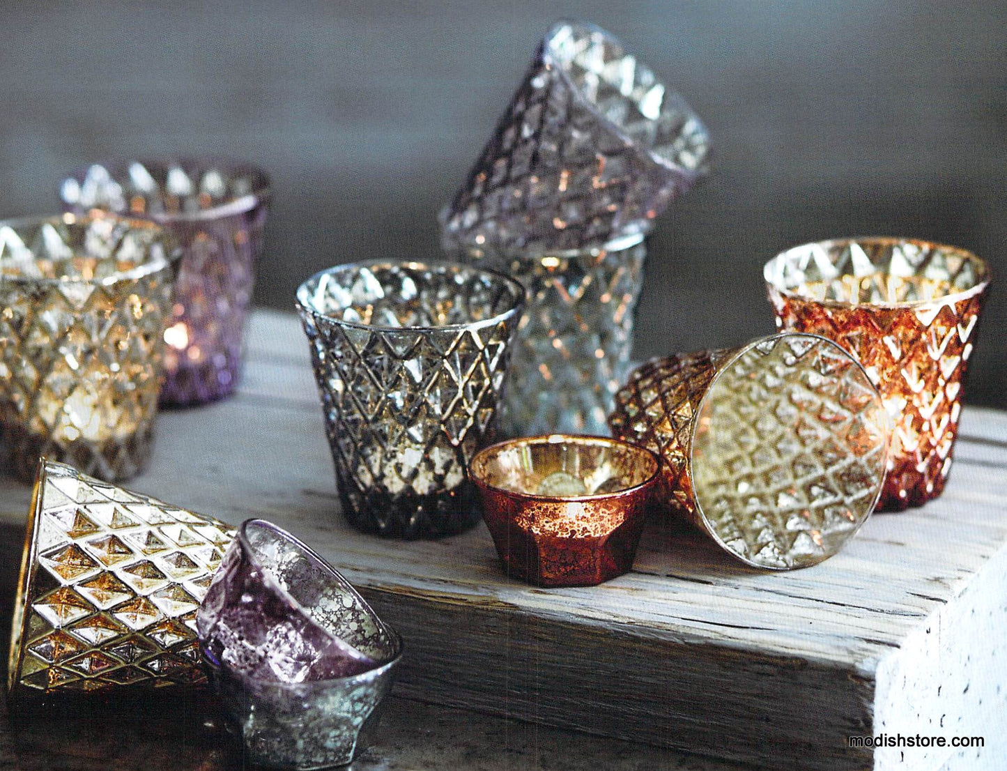 Mercury glass tealight holders made of delicate borosilicate glass with diamond and fluted textures create an enchanting visual interplay in cool and warm translucent jewel tones. Tealight or Votive available.