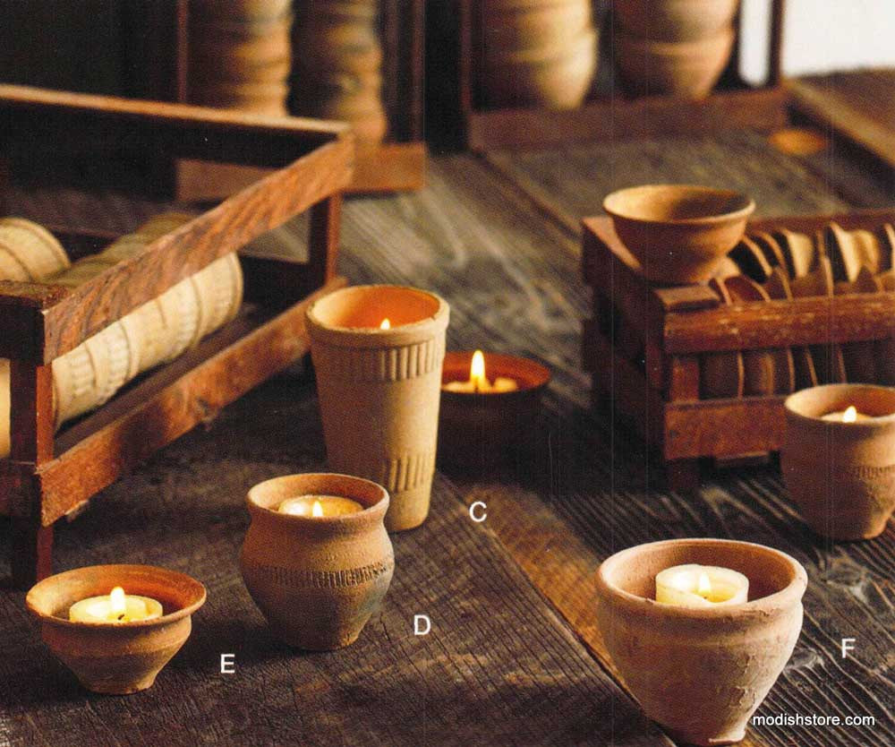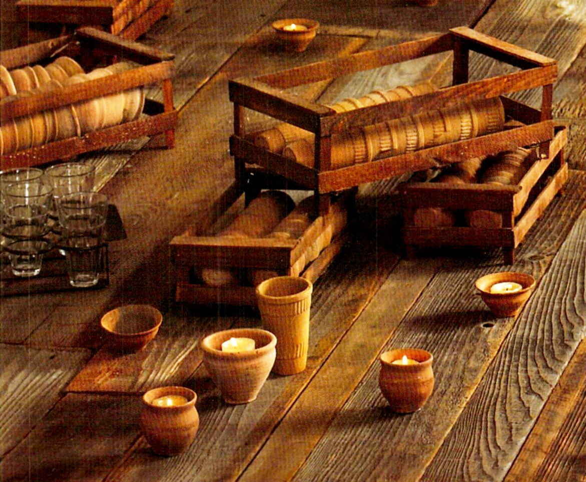 These perfect votive holders add a soft glow to anyal fresco gathering. The small wood crates hold different shapes of low fired mini clay pots.