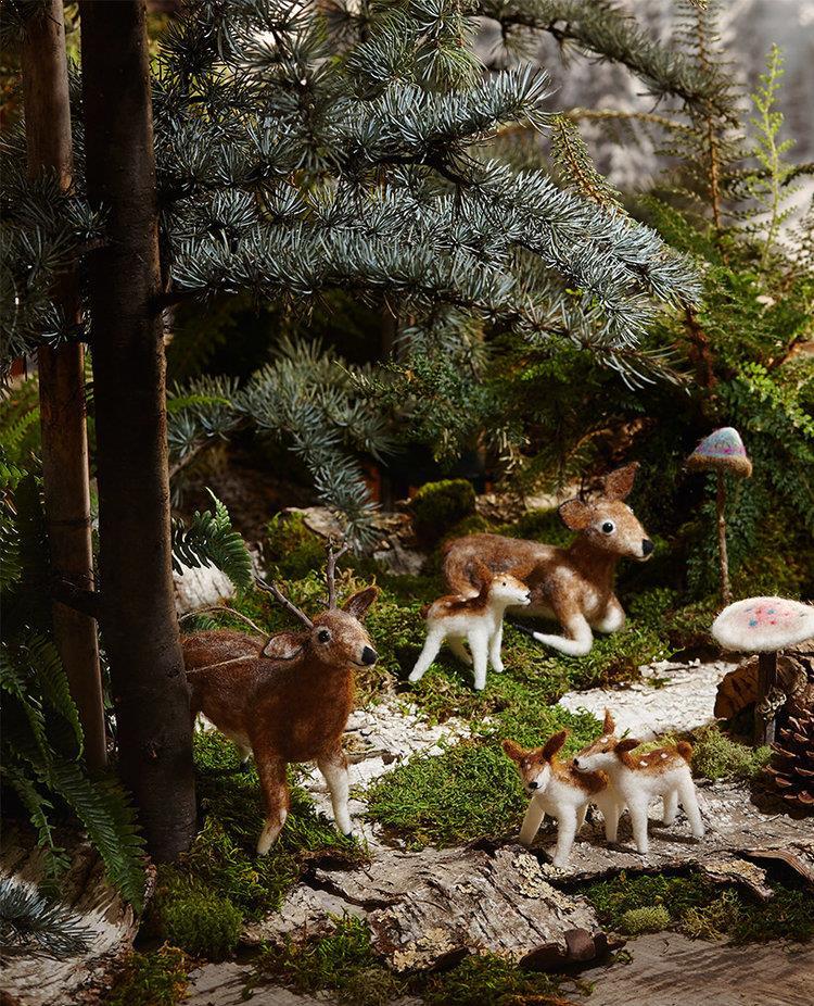 Charming deer ornaments handmade from soft felt gracefully inhabit any woodland diorama or holiday tree. Each ornament has a jute hanging loop. These ornaments are sold as a set of five; a complete deer family as shown with a buck, doe and 3 fawns.