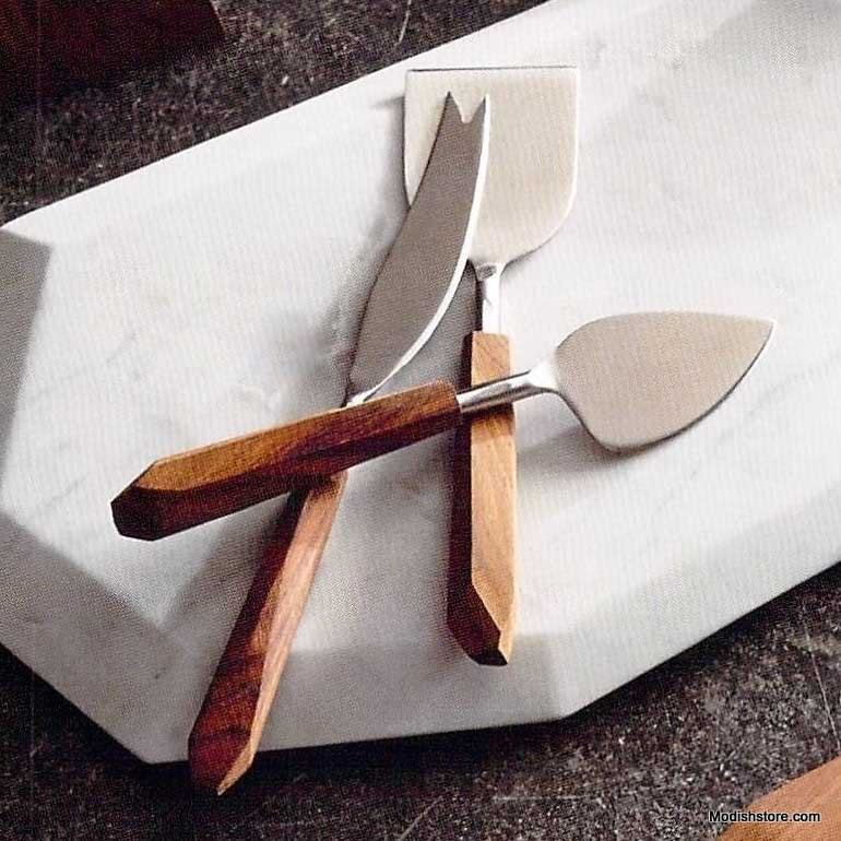 Rich-toned and beautifully grained selected sheesham wood, also known as Indian rosewood, is shaped by hand into faceted serving boards. A set of three cheese tools marries stainless steel blades with perfectly carved faceted wood handles.