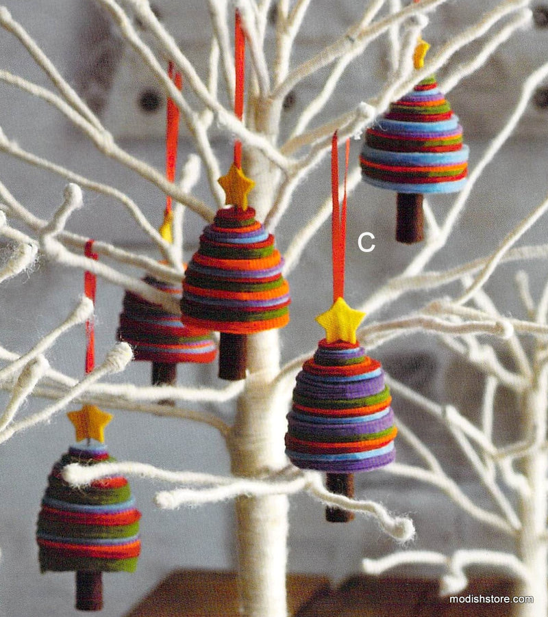 Rocky the Rooster is made of wool felt cut and sewn in seven bright colorways. Five little multi-colored felt trees topped with bright yellow stars and red satin ribbon hangers complete the collection.