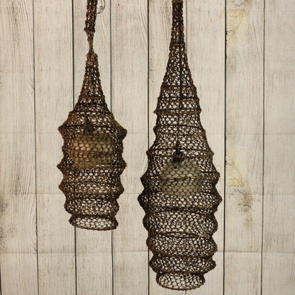 Nautical themed, hand knotted, pendant lamps bring up memories of fishermen's nets hung on poles by the sea. These lamps are created using the same knots that fishermen use for making meshes. Made out of dark brown twine, they have a rather large sized globe bulb suspended within it. Hand-crafted and made out of locally available organic twisted thread. These lamps, are designed by native craftsmen of the Philippine Islands showcasing the best of sustainable lighting.