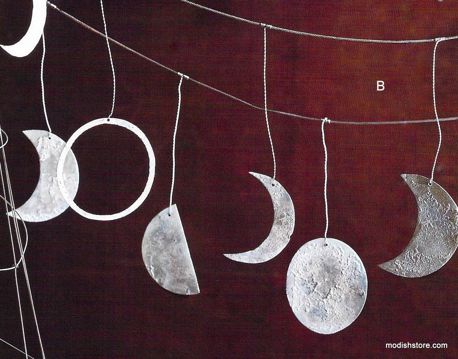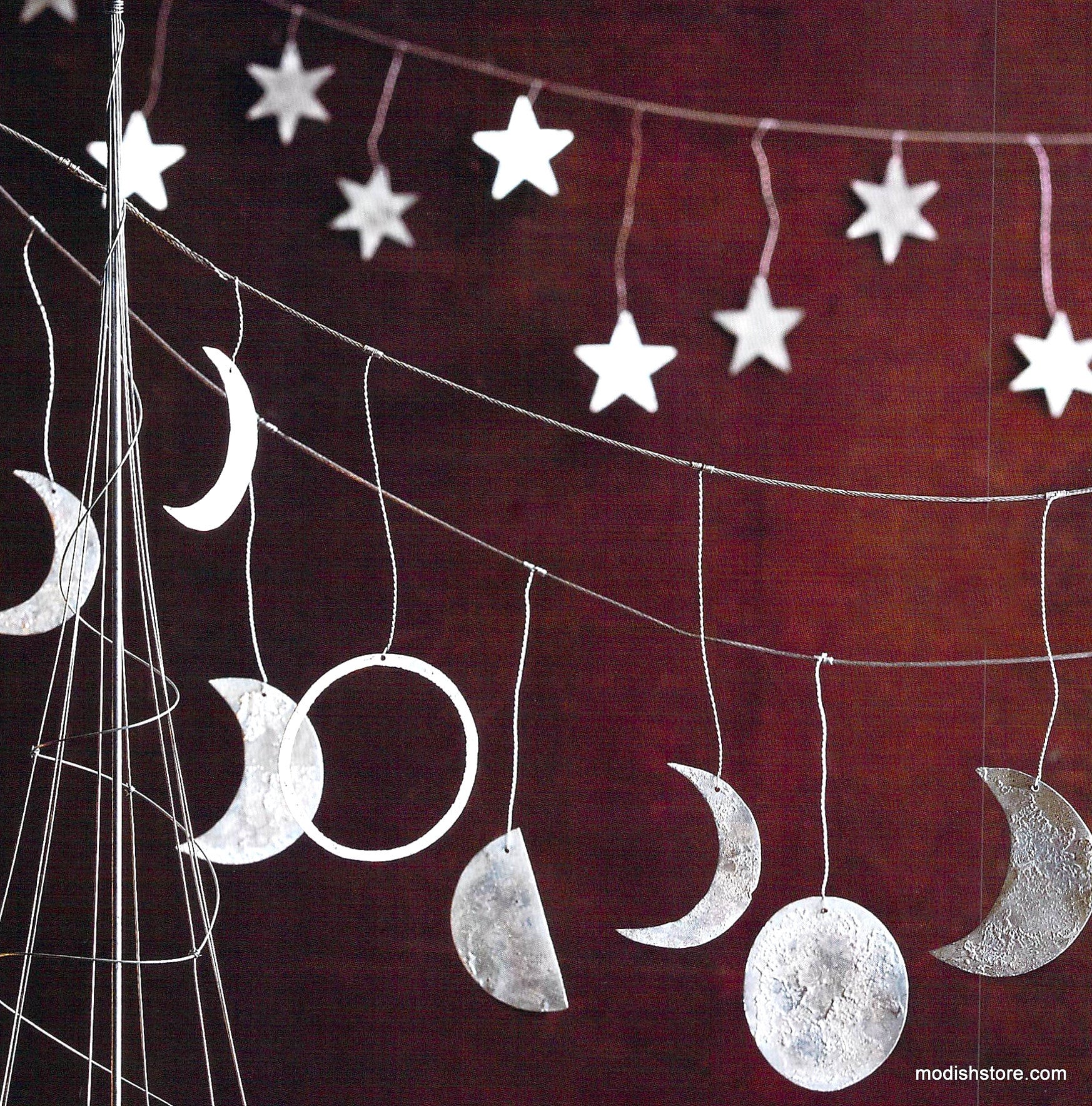 Our silvery Phases of the Moon Garland captures the magic of the waxing, waning, new and full moons. Hand-cut from iron sheets, each piece is plated with silver to create a shimmering textural finish resembling the lunar surface. Phases of the Moon Garland features moons dangling from thin silver-colored wire with loops on each end for hanging. The Star Garland features hand-cut stars with the same rustic silver finish which are suspended at different lengths from a six-foot metal cable to add festive spirit to any scene.