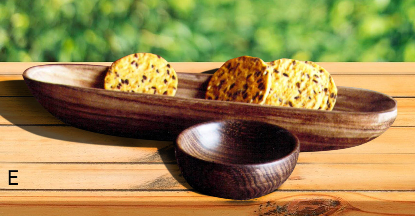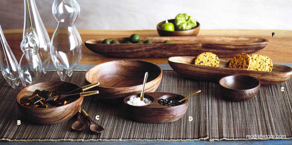 Smooth and beautifully grained Shesham wood, also known asIndian Rosewood, is hand carved into a broad collection of serving pieces. The versatile set of nut bowls has nicely rounded edges. Deep olive canoes double as vessels for crackers and other party nibbles.