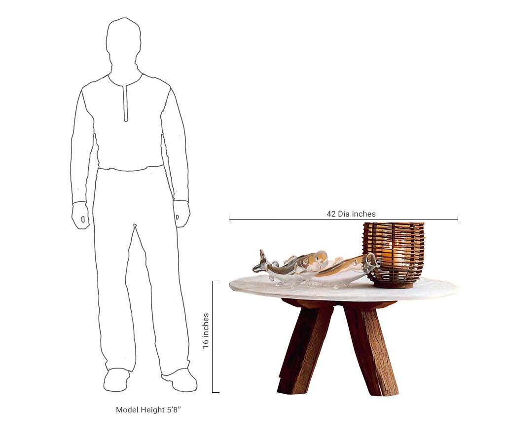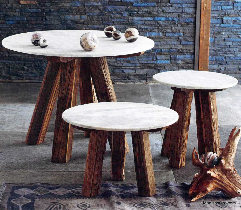 The contrast of lightly sandblasted marble tops and bases of recycled railroad ties creates the rustic grace of this table collection. These hand-crafted pieces are available in cafe, side, coffee and low table styles.