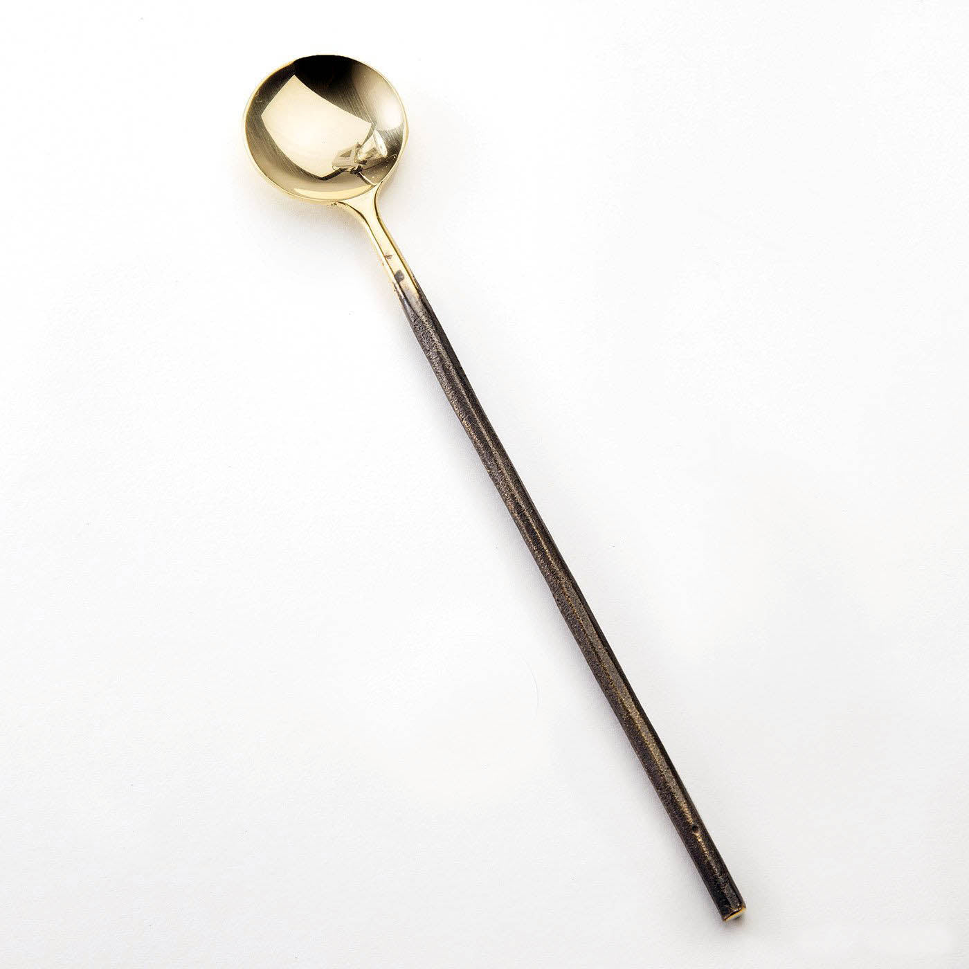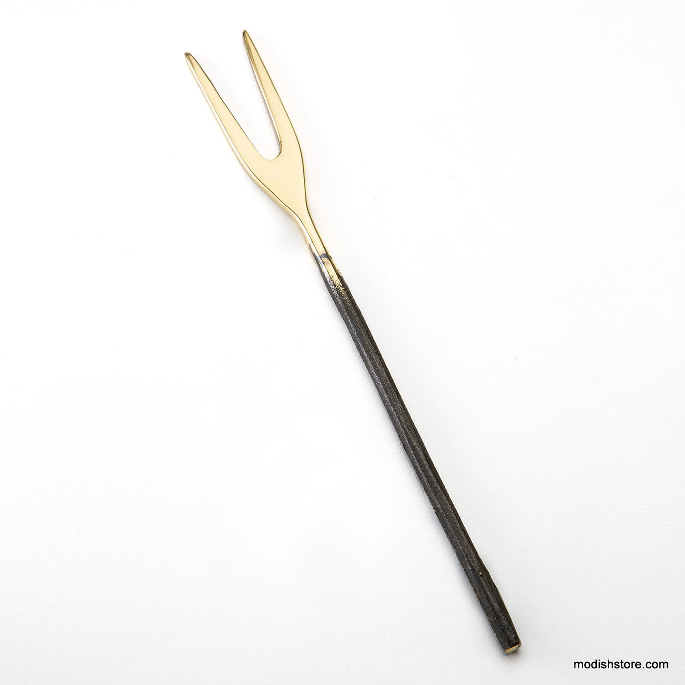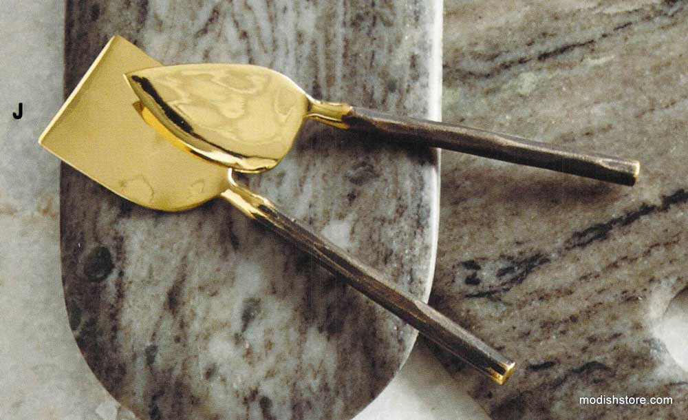 Cocktail cutlery and serving pieces in sleek modern profiles are formed from solid brass with polished heads and slender blackened handles. Shiny polished brass implements with slim contrasting handles, have graceful profiles. Check the Roost Serafina Collection for related products. Hand wash only.