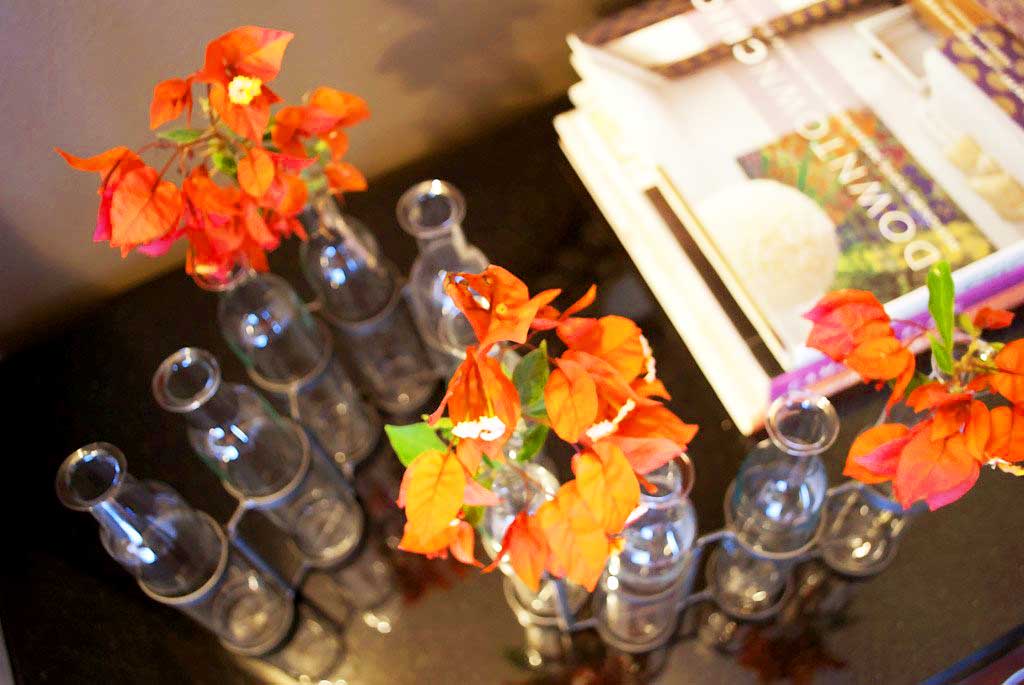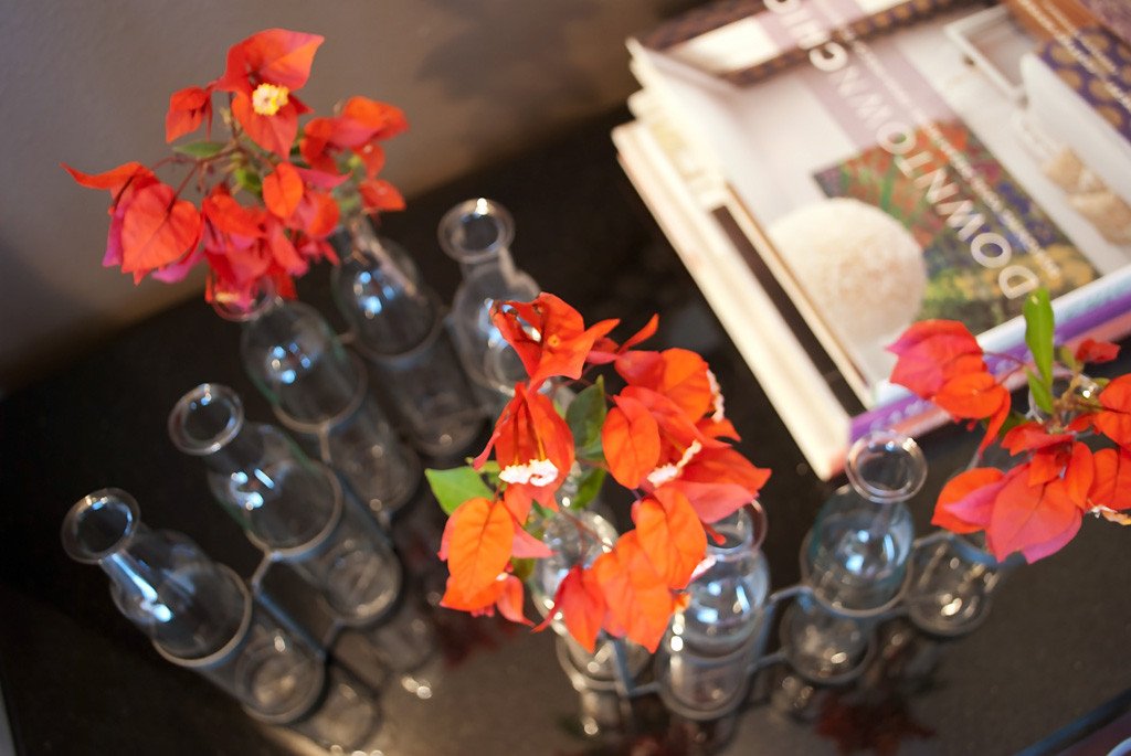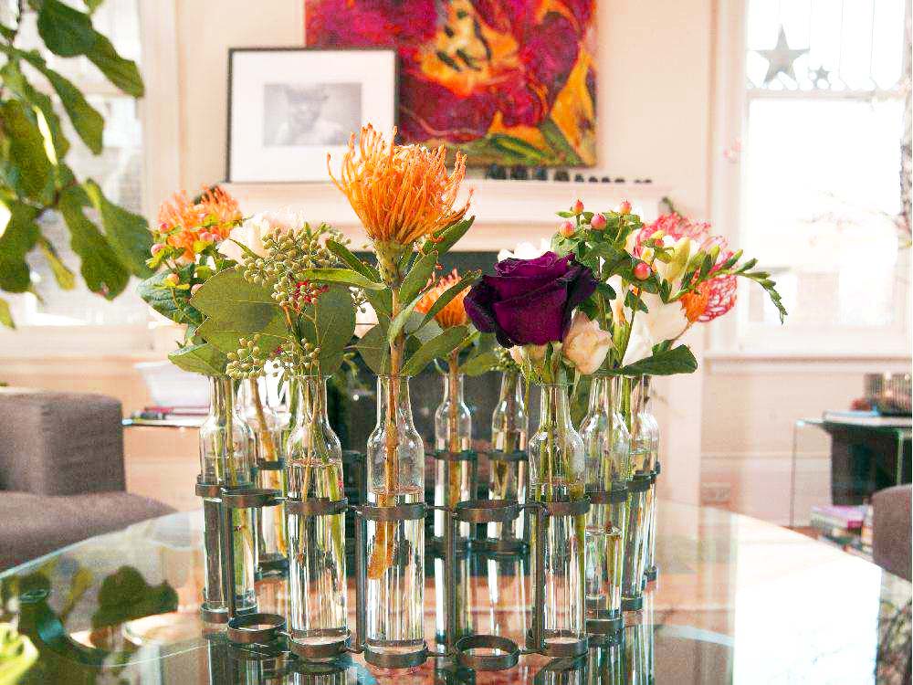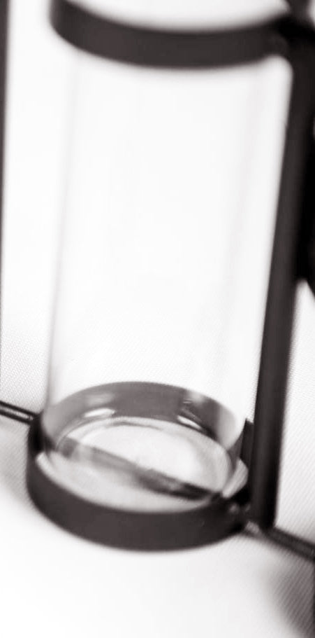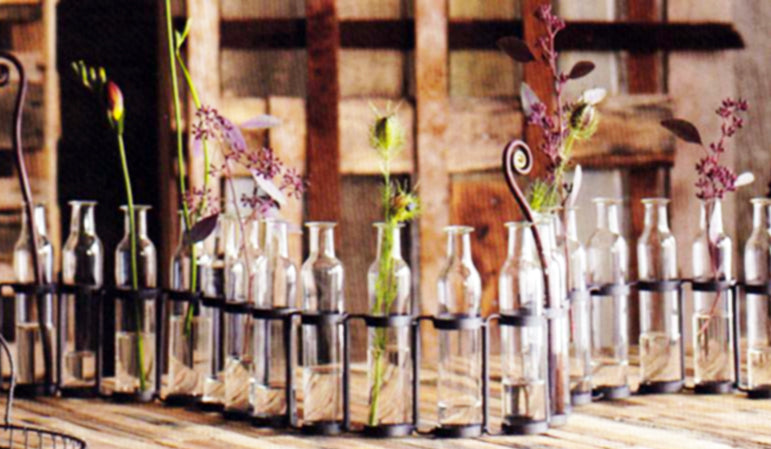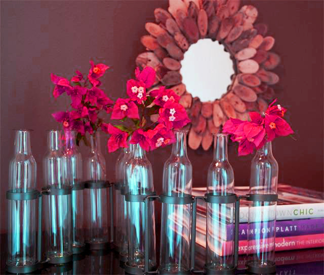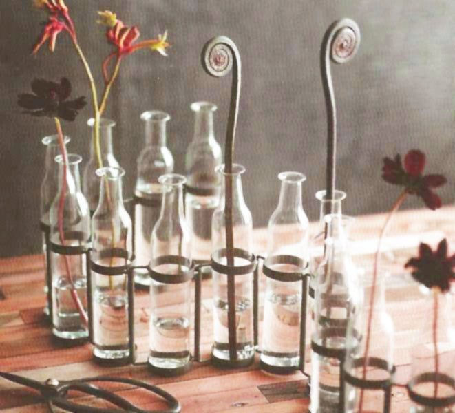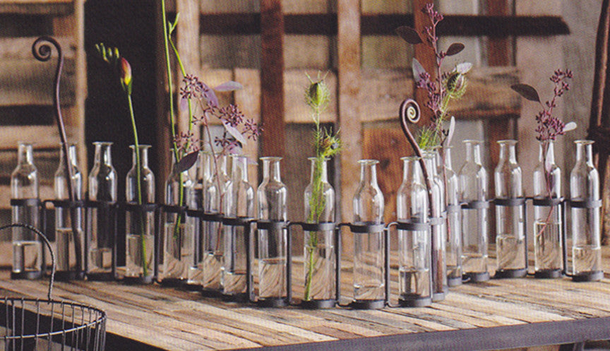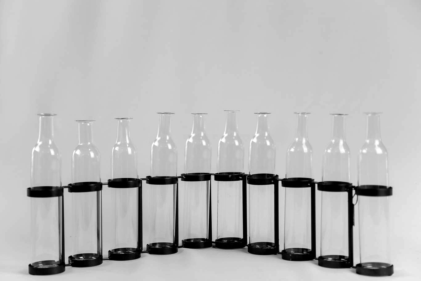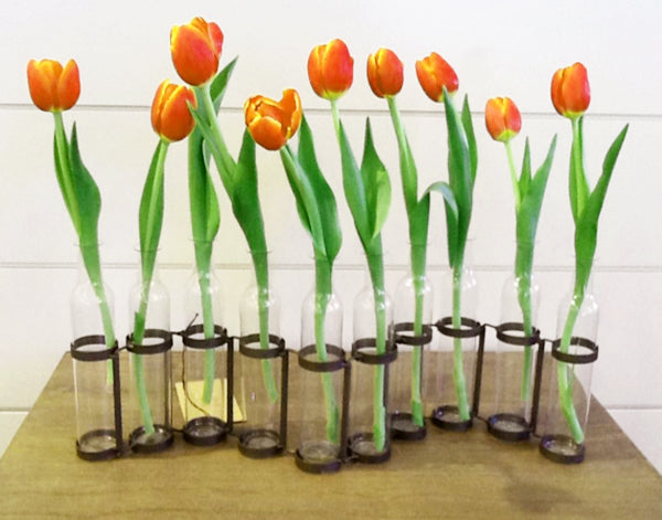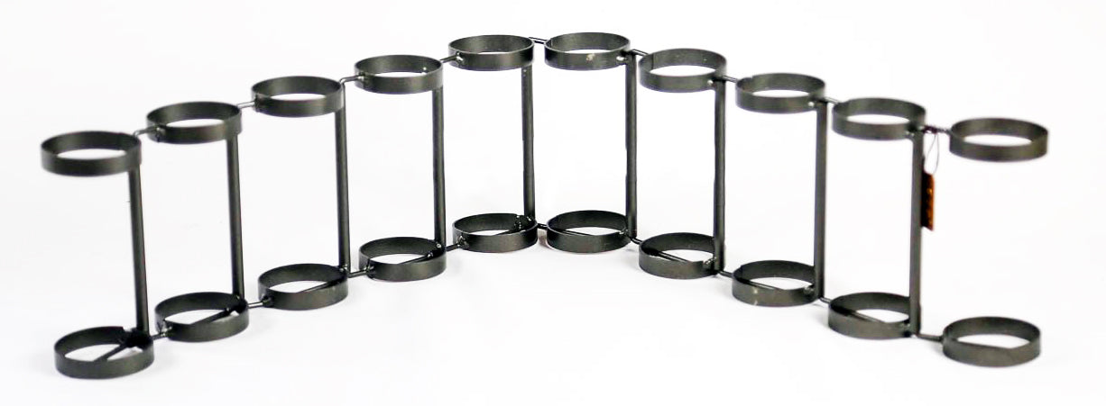 This vase is a sinuous row of 10 vessels or 20 vessels, joined by metal brackets in a darkened zinc finish. Coil or curve, any which way. Delicate looking, but strong. Made of borosilicate glass.