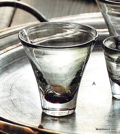 Swooping rocks and shot glasses are perfecto for sipping tequila or zesty mezcal- based libations and feel sauve in the hand. The thick-walled glasses are lightly sage-green tinted, with a dollop of amber in the bowl of the glass and a solid, clear sham.