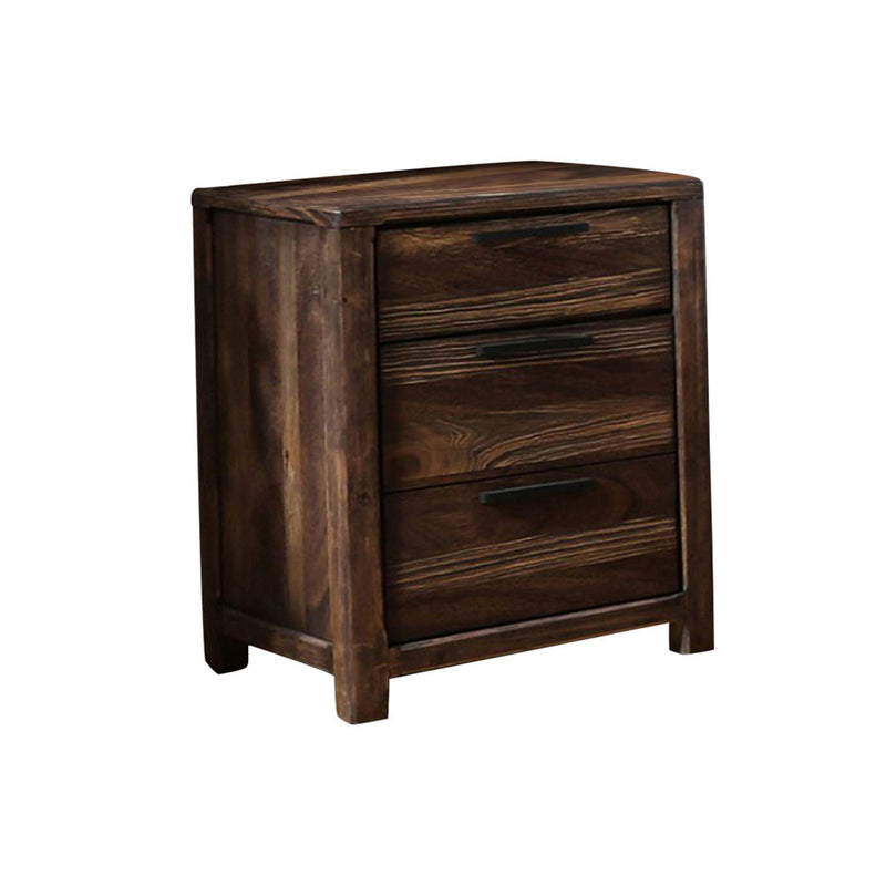 A compact transitional style night stand made in quality wood with rustic natural tone finish, including three drawers. Avoid scratching the surface with sharp objects but you can wipe it with a clean cloth. With all of its look, it grabs much attention towards itself. Matching case goods are each equipped with ball bearing metal glides and felt-lined top drawers.