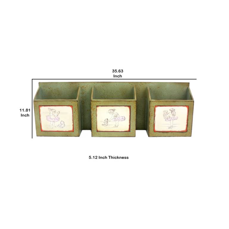 Rustic Horizontal Wall Organizer With 3 Slots And Metal Hooks, Green By Benzara