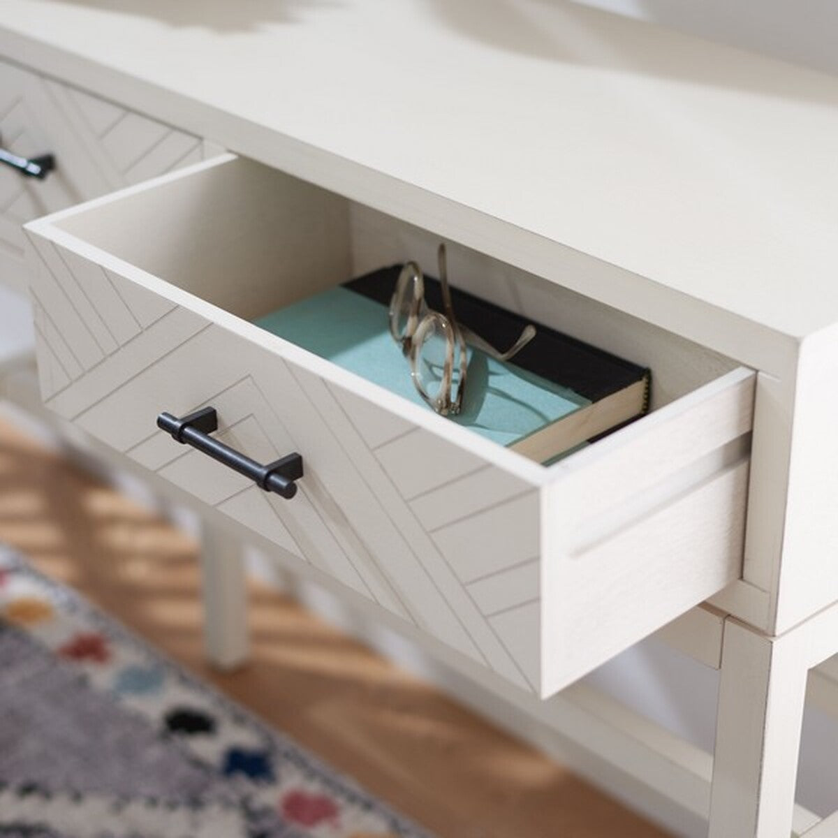 This Ajana Console is a marvelous m̩lange of modern minimalism and abstract art. Ajana‰۪s clean lined Parson‰۪s frame is beautifully offset by the herringbone inspired chevron pattern on its two drawers. Designers love Ajana‰۪s d̩cor smart distressed white finish.