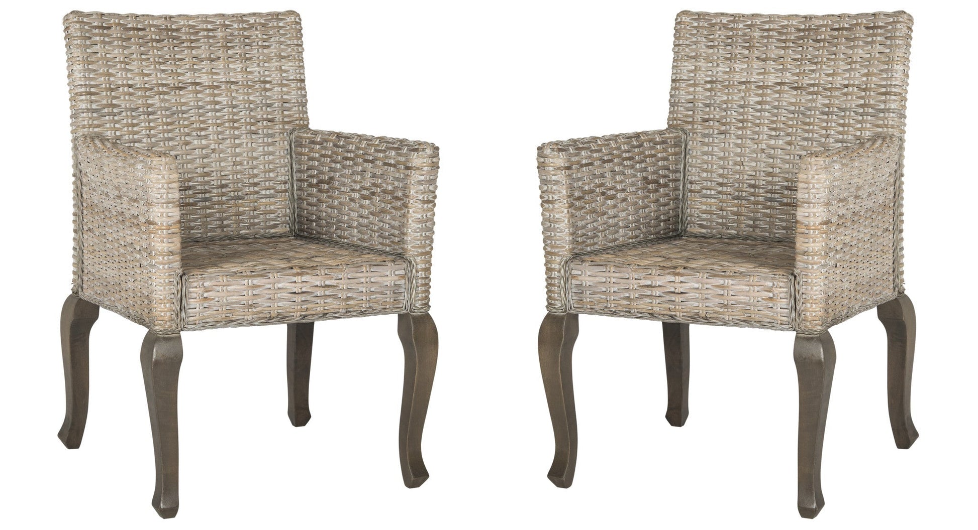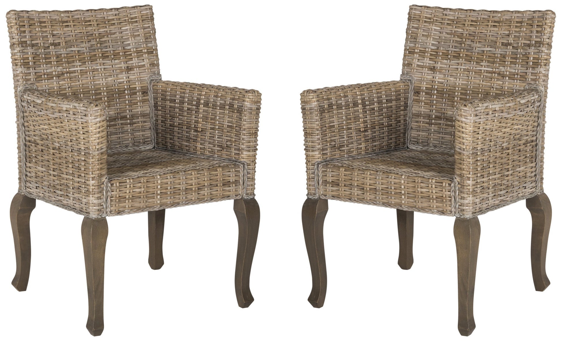 Casual dining get a formal twist with this dining chair paring a natural Kubu rattan woven seat with straight back and high arms atop warm brown French cabriole hardwood legs. Each artisan woven rattan chair is unique in natural shading, pattern and color.