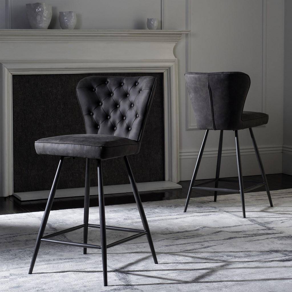 This upscale mid-century counter stool instantly updates any contemporary dining area with vintage curves and sleek metal legs. Designed for the modern jetsetter, its leather-style upholstery with tufted detail brings character and warmth to the table.