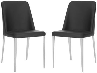 Indulge in comfort and style with this set of two luxe modern side chairs in white PU leather with polished stainless steel legs. Their contemporary design adds drama to kitchen or dining room with a low profile silhouette that visually expands a room.