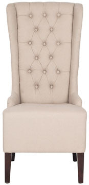 The slip-cover look is recreated in the Bacall high back chair with its slightly tapered backrest and sloping arms. Covered in linen fabric in the hemp color way and with black finish on its birch wood legs, the dramatic Bacall is all about smart sophistication.