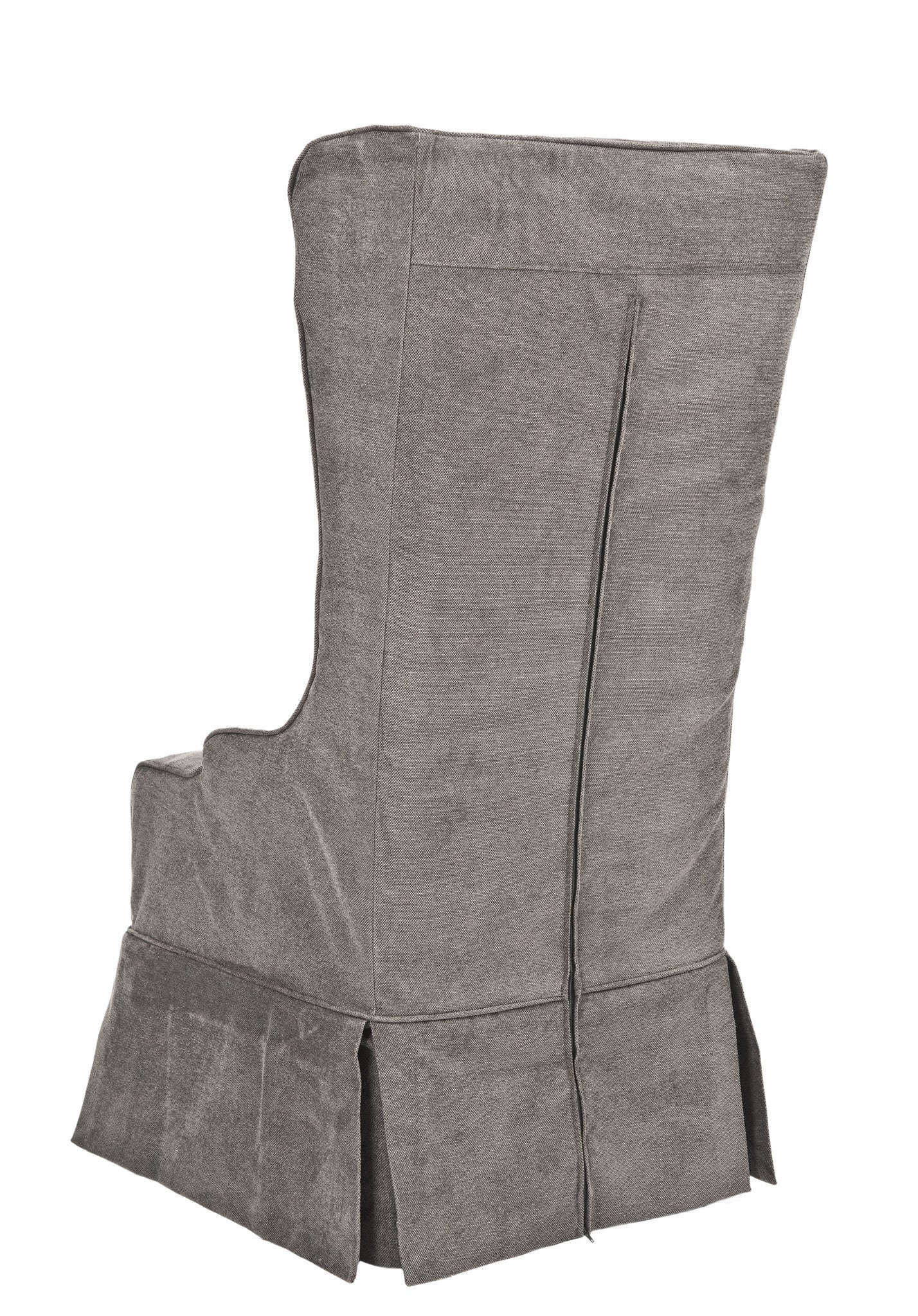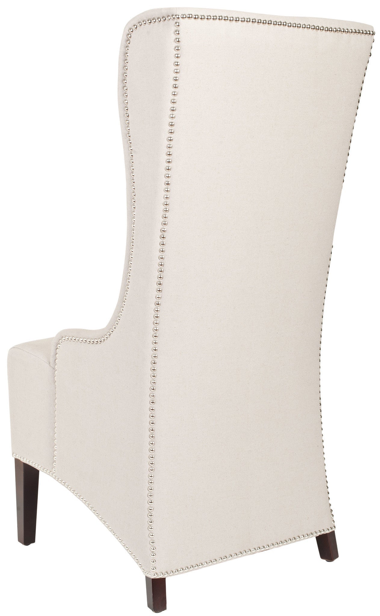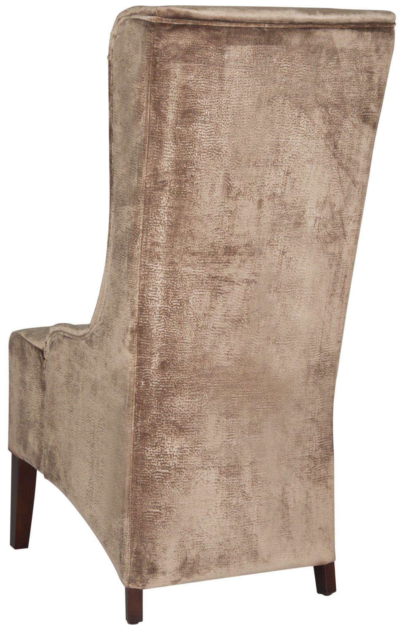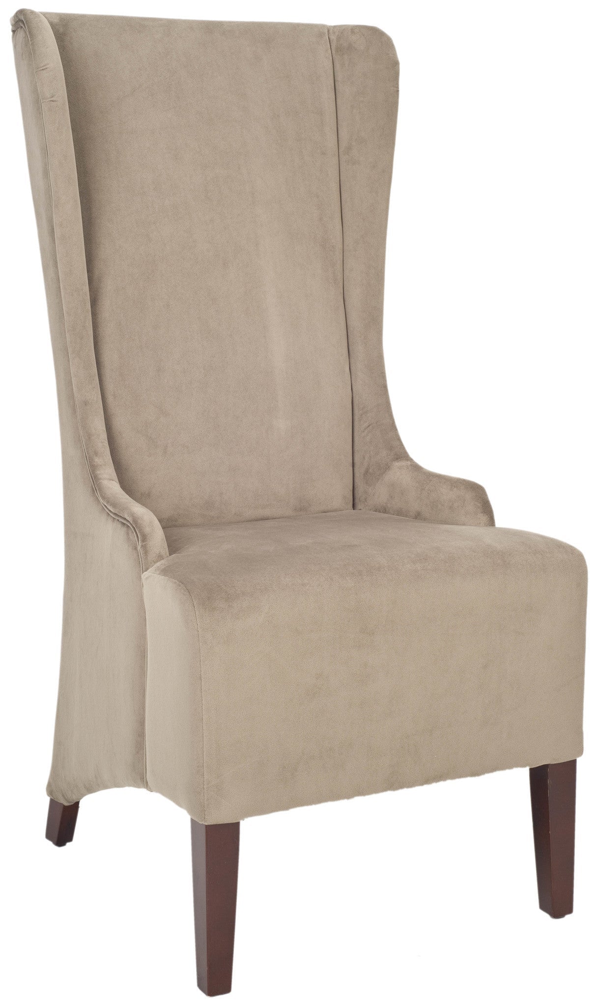 The Bacall high back chair, in dark champagne cotton fabric and cherry mahogany finished legs, absolutely commands attention. With a reaching, slightly tapered backrest and sloping arms, the dramatic Bacall is all about smart sophistication.