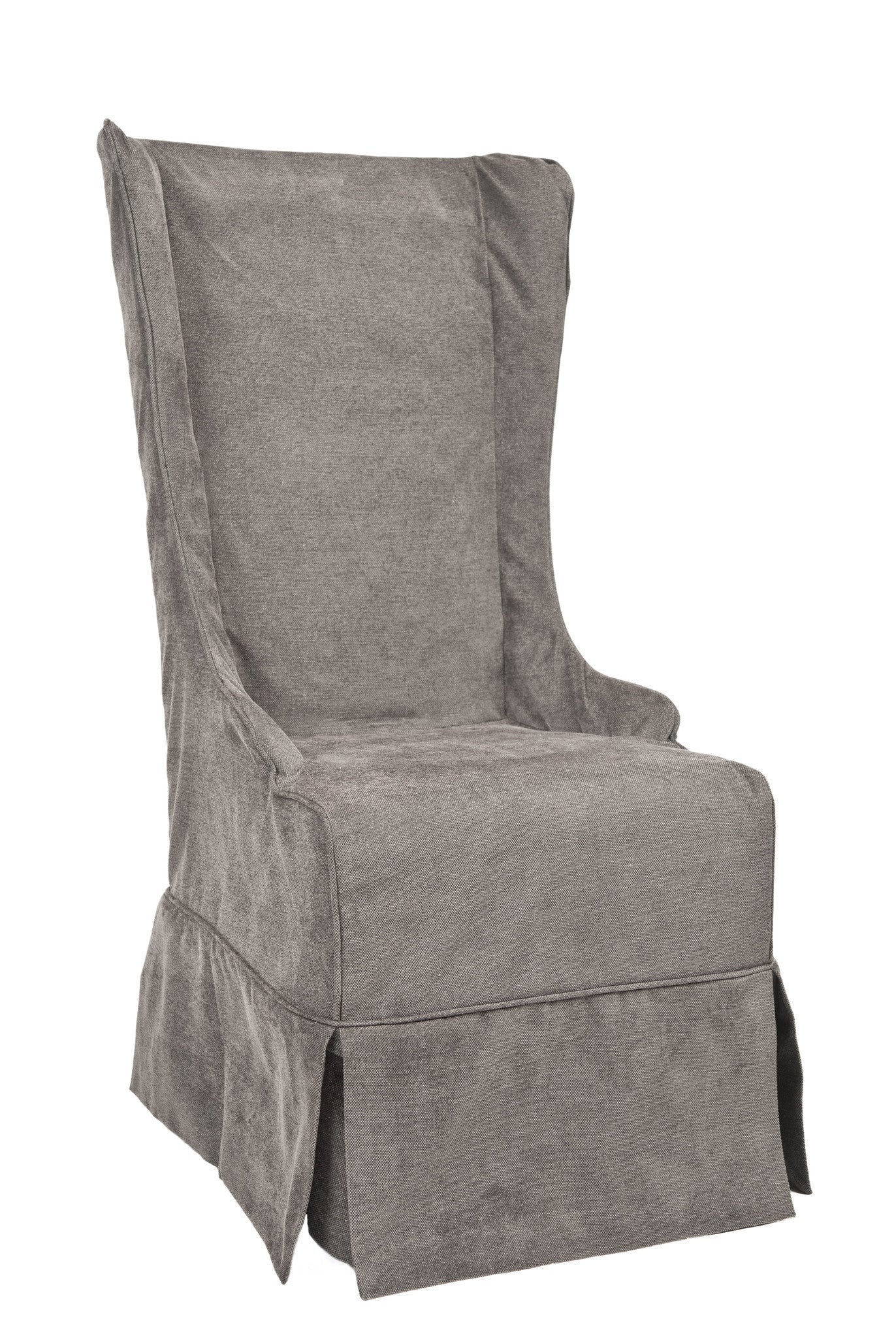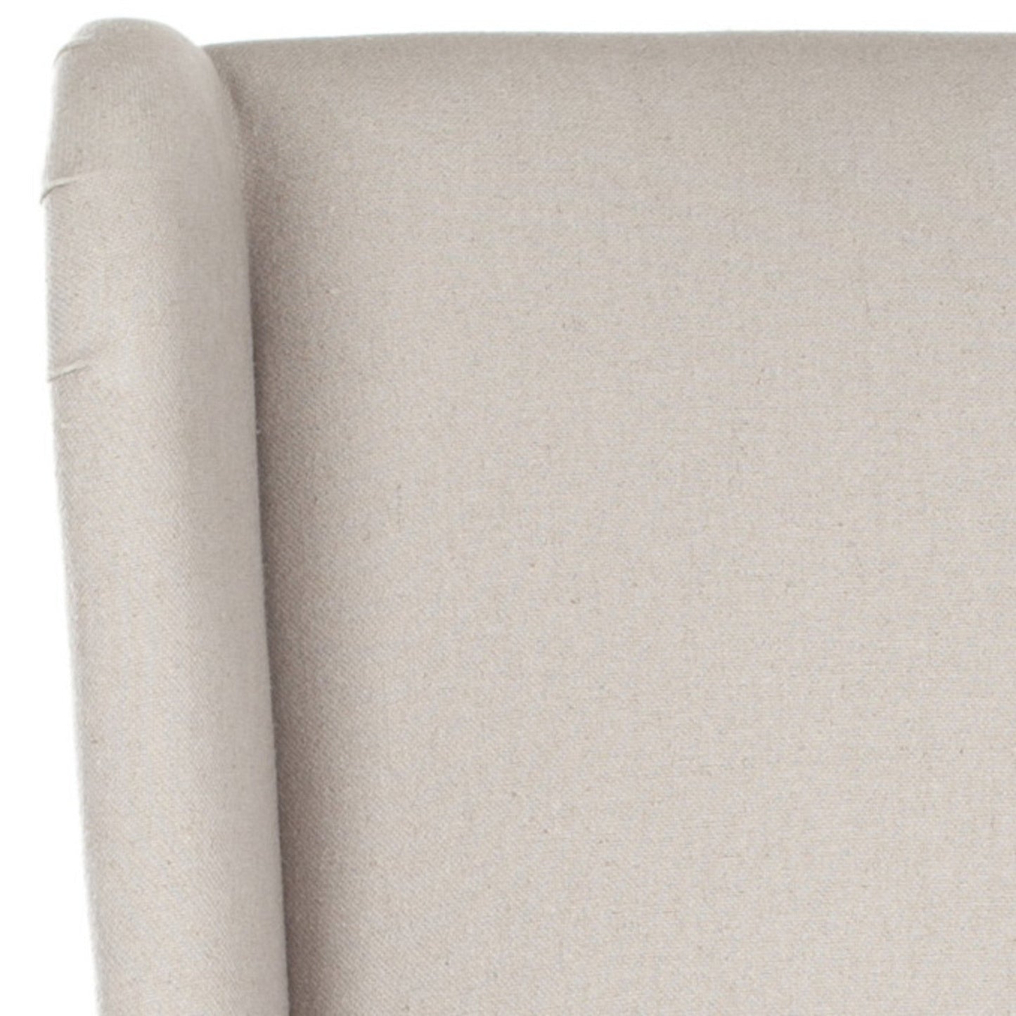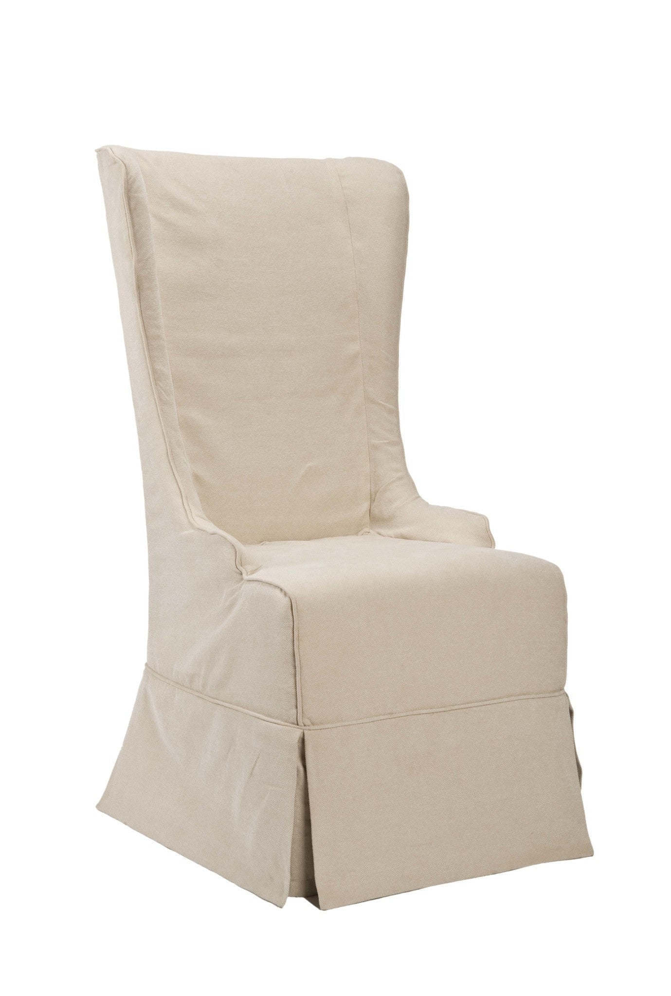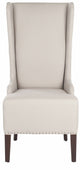 The Bacall high back chair, in dark champagne cotton fabric and cherry mahogany finished legs, absolutely commands attention. With a reaching, slightly tapered backrest and sloping arms, the dramatic Bacall is all about smart sophistication.