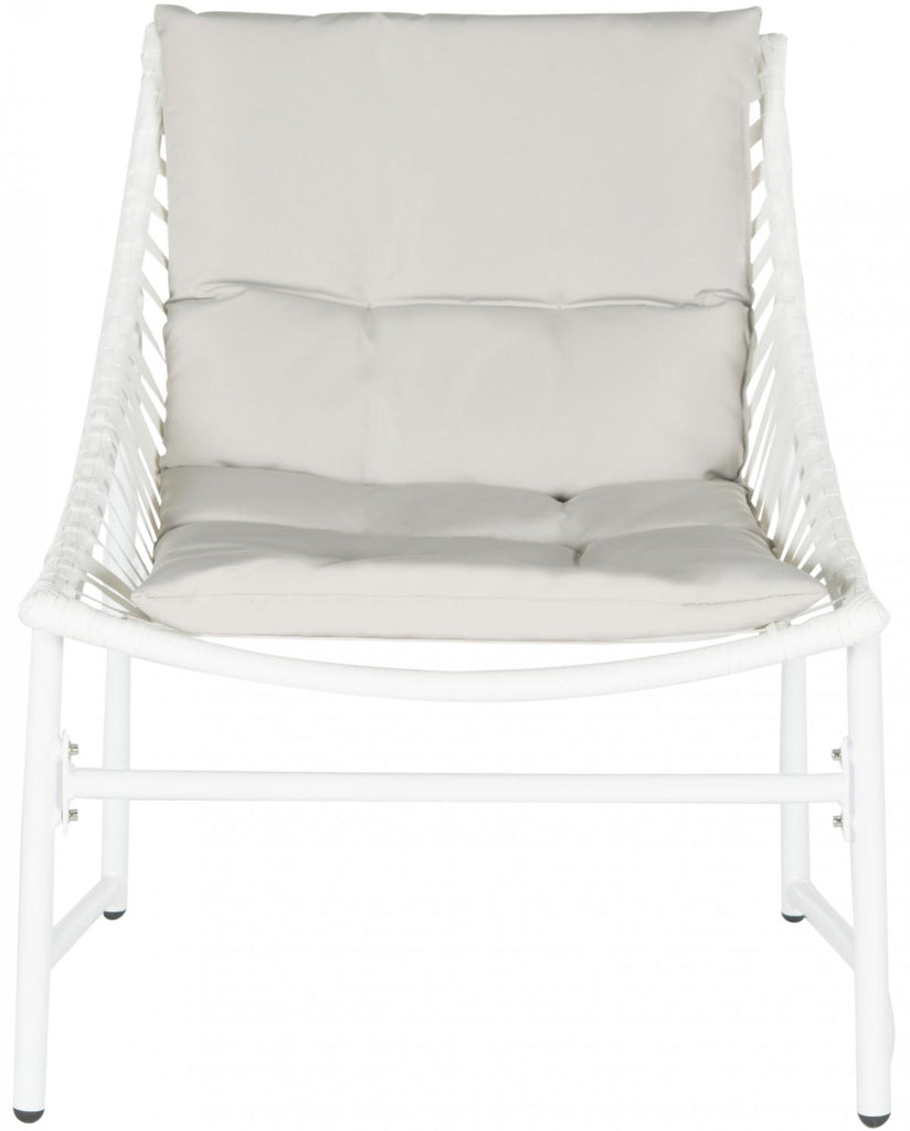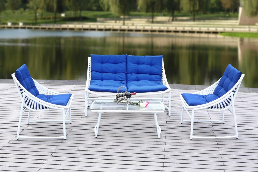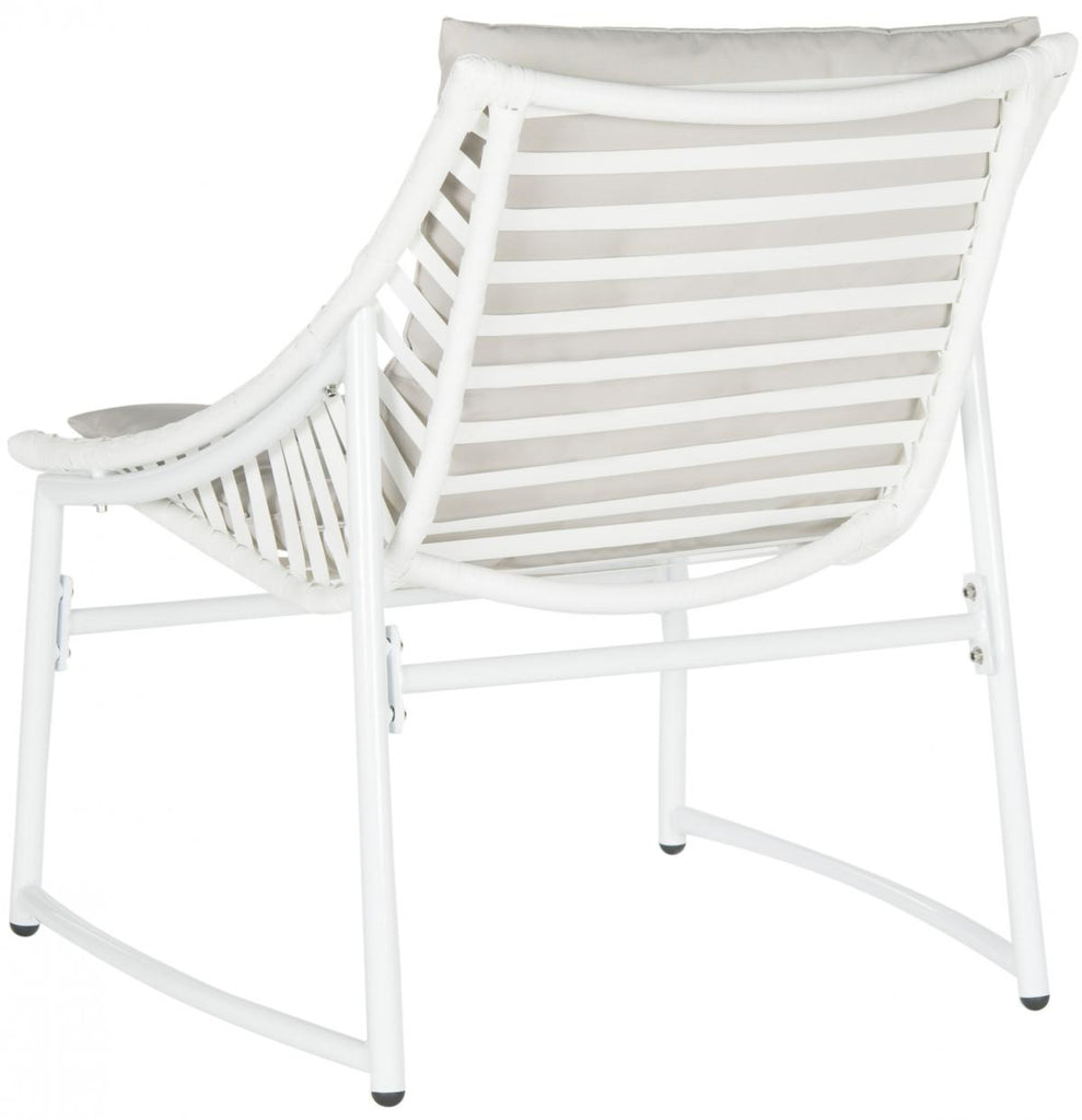 Raise the style quotient of your patio with the 4-piece white rattan Berkane outdoor furniture set with grey all-weather cushions. A contemporary strap effect on seating of powder coated aluminum inspired the design of the coordinating coffee table.