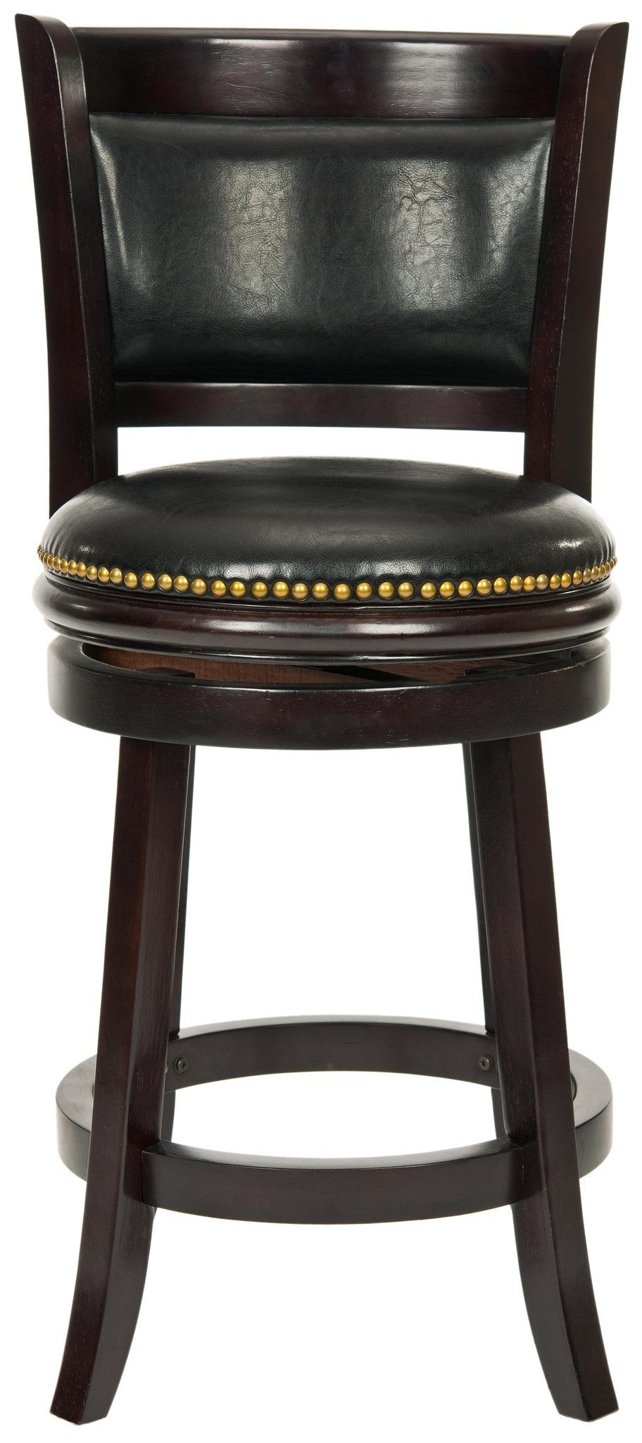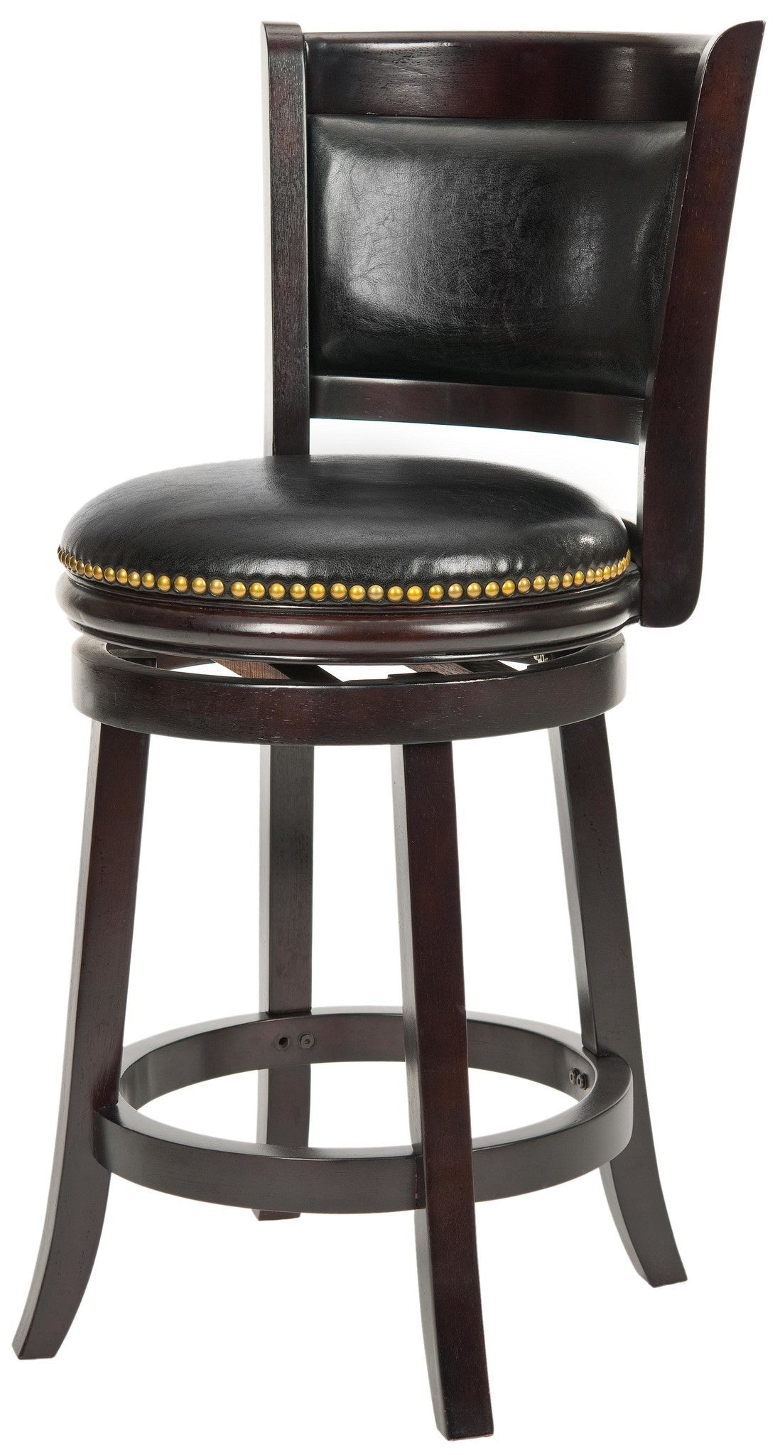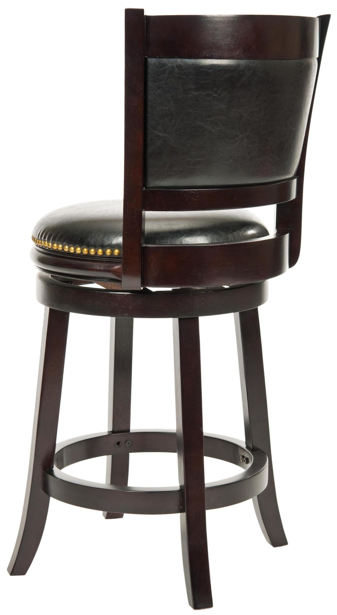 The Brockway Swivel Counter Stool is designed to give your home fashion and function with a frame crafted of Malaysian Oak with a cappuccino finish and a swivel seat covered in black bi-cast leather. The seat back features an inset cushion, also covered in blackåÊbi-cast leather, for comfortable sitting at counters and pub tables. The seat height is 24 inches. Assembly required.