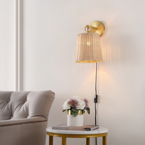 Make a unique style statement with the Ciaran wall sconces. An elegant brass arm extends from the wall to hold a sleek bell-shaped rattan shade. With minimal yet fine details and an elegant textural mix, our wall sconce enlivens your home with a touch of sophistication. It directs light downwards to serve as the perfect complement to your entryway, bedroom, or bathroom.
