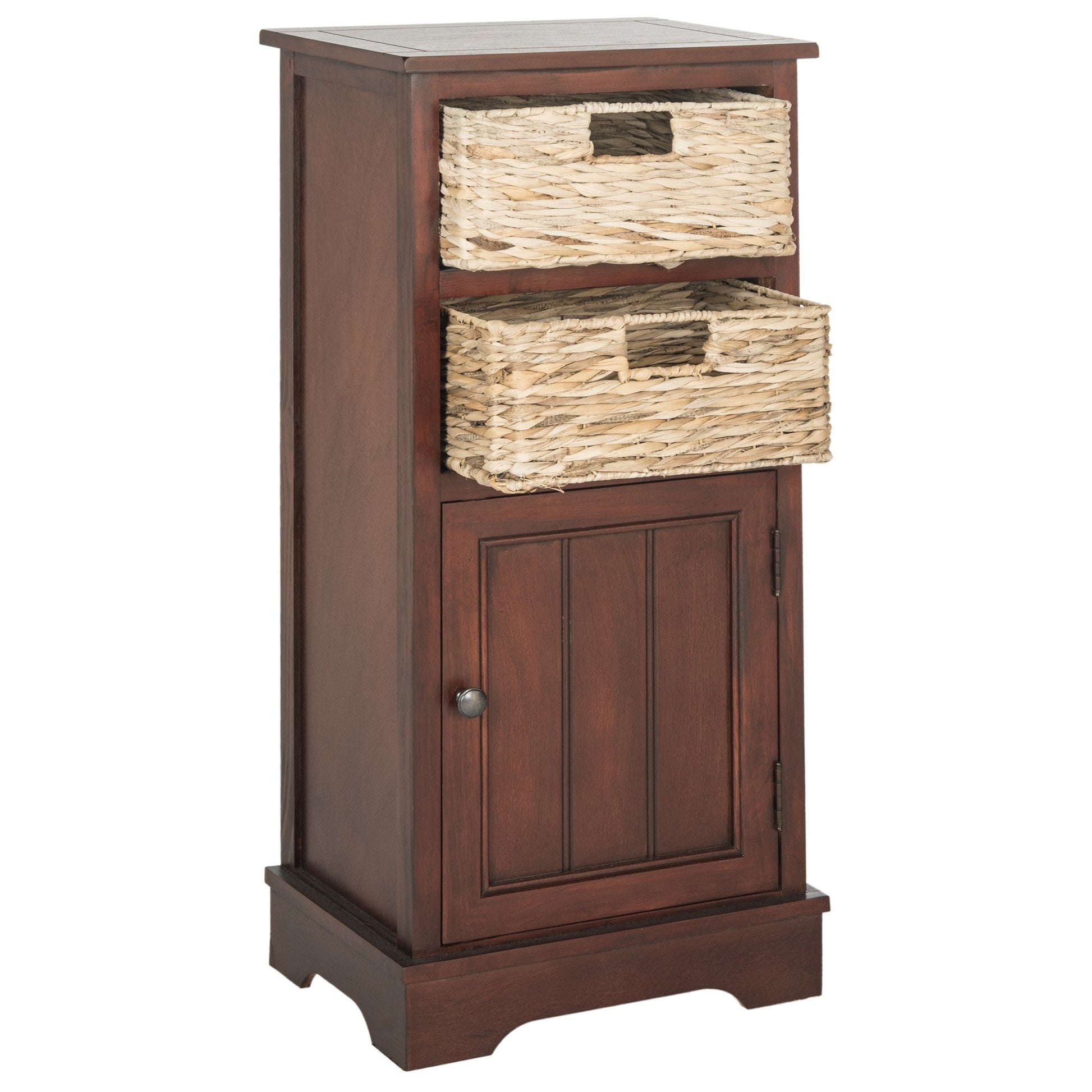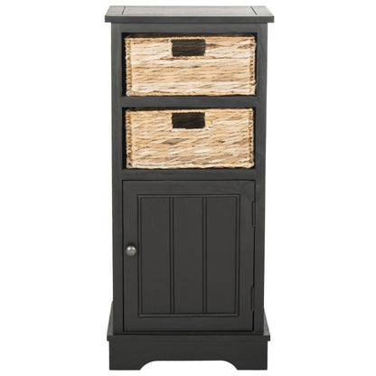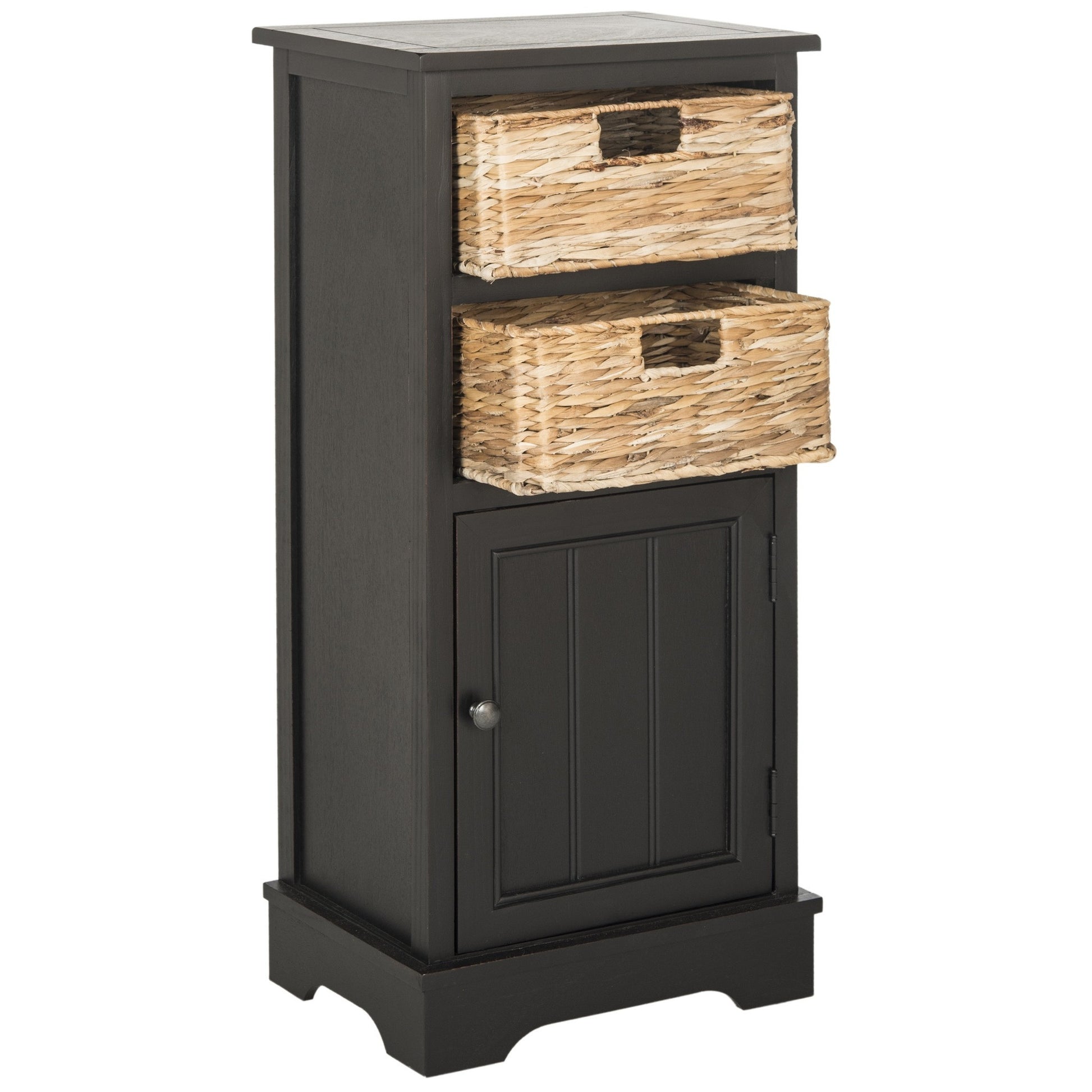 Easygoing casual charm characterizes this pretty but hardworking distressed black storage cabinet, a stylish addition to any space in need of organization. Crafted of pine with wicker baskets above a closed-door cabinet, it stows essentials close at hand.