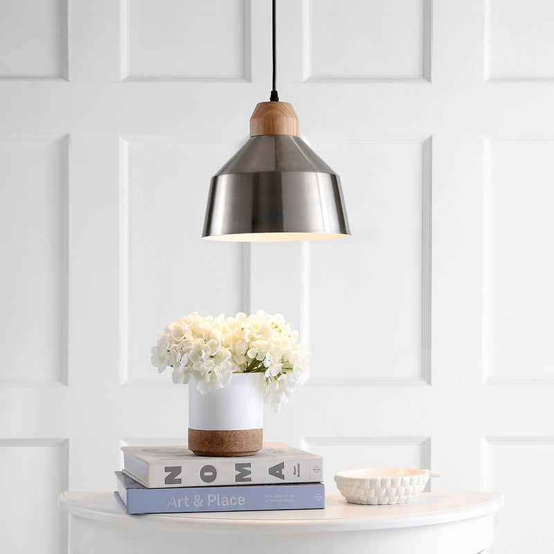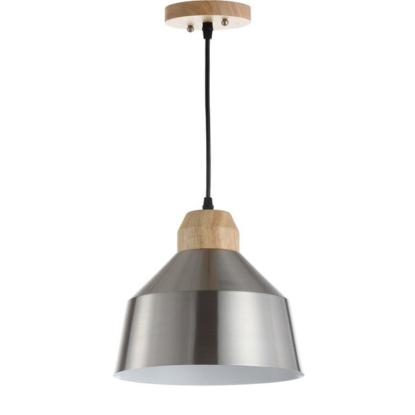 Bring industrial chic style to any bedroom, living room, or kitchen with this modern pendant. Crafted with a shiny nickel shade and contrasting light brown wooden accents, its sleek design adds just the right amount of contemporary flair.