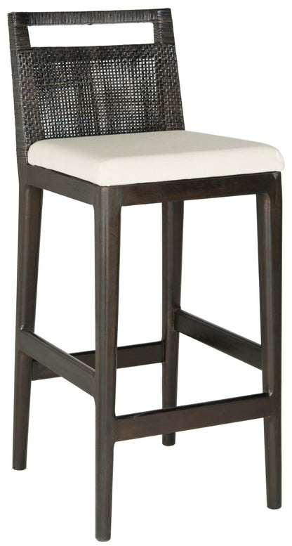 Spa life. Furnishings at five-star resorts in the Maldives inspired this casual Darin Barstool. Minimalist geometry and clean lines complement their finely crafted black rattan and mahogany body and easy-care black poly-acrylic cushions.