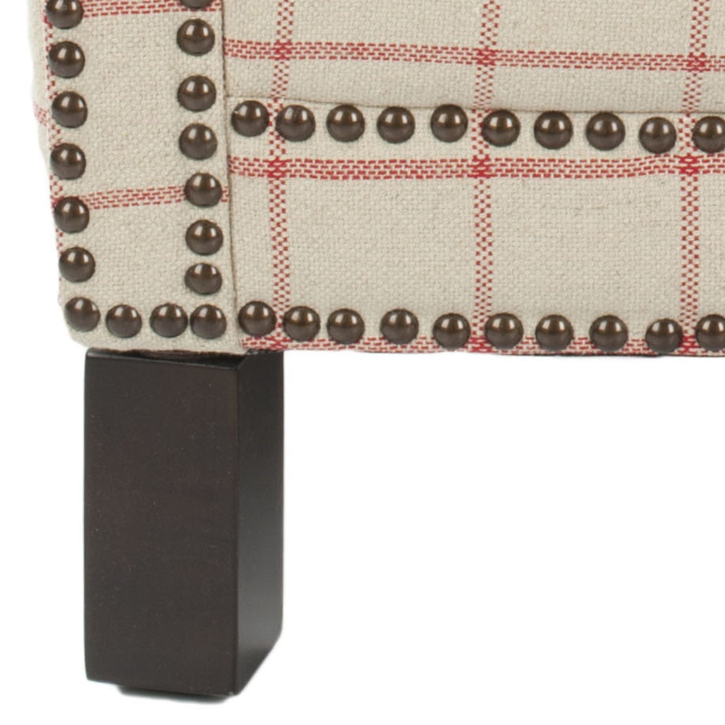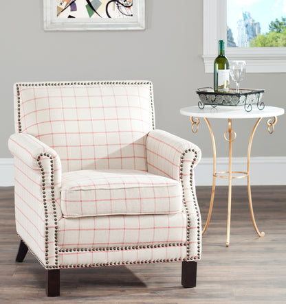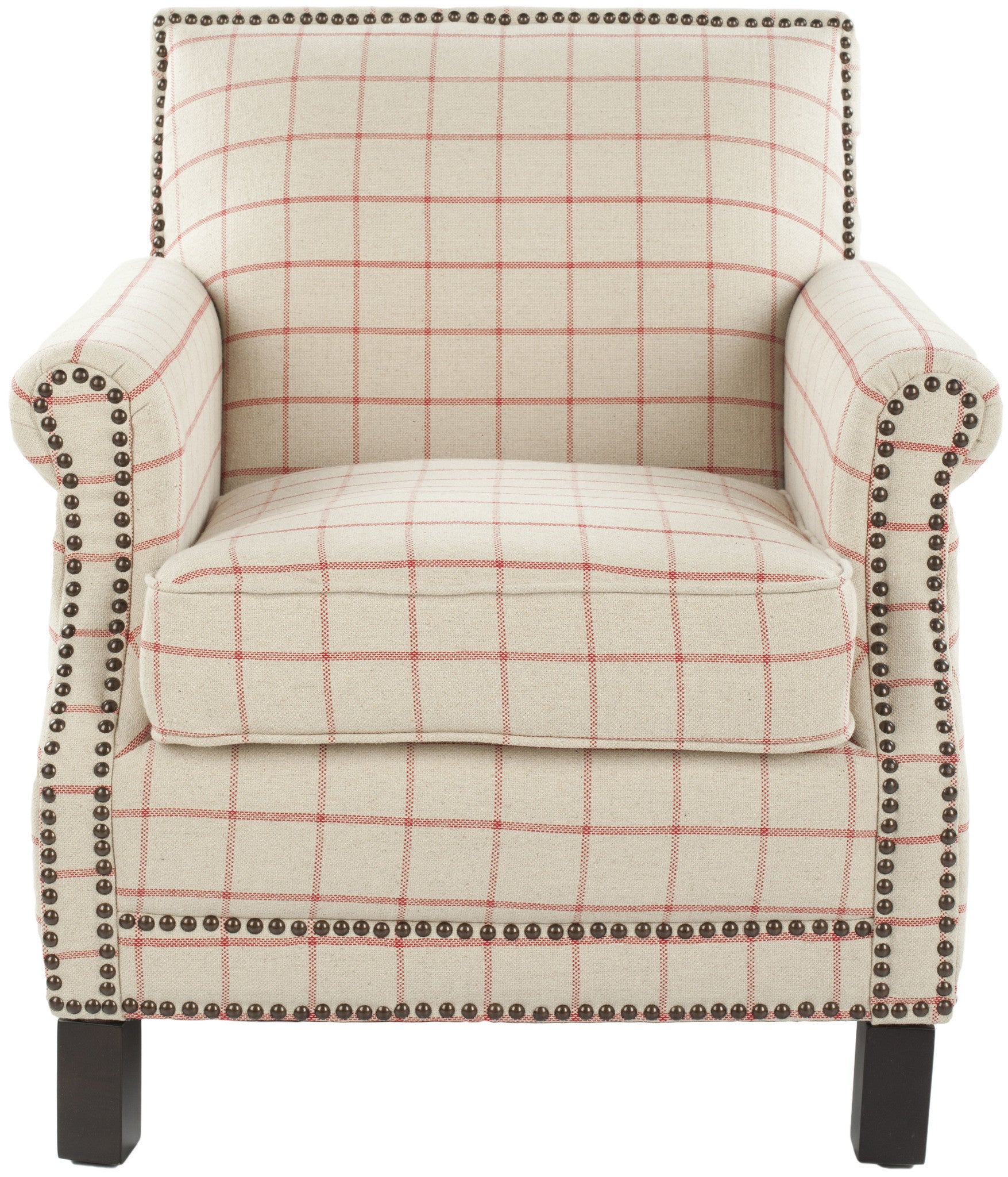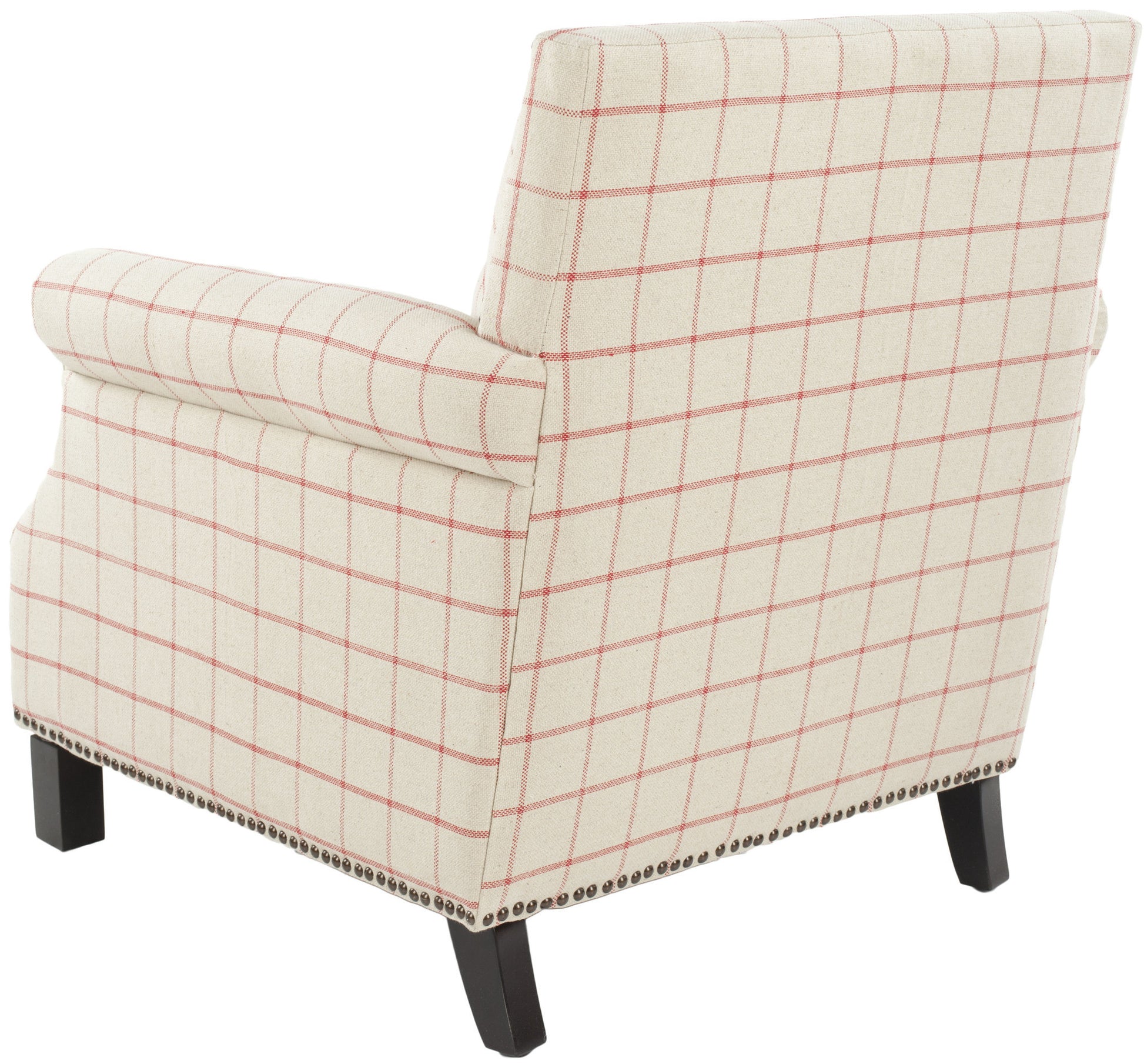 The distinguished Easton chair, with slender frame, roll arms and brass nail head details, is a fireside classic revved up with orange and cream windowpane plaid cotton blend fabric. Standing on birch legs with an espresso finish, this comfy club chair is an easy-going version of a den and library favorite. Designed for small spaces, the transitional Easton chair adapts to traditional, country and soft contemporary settings with ease.