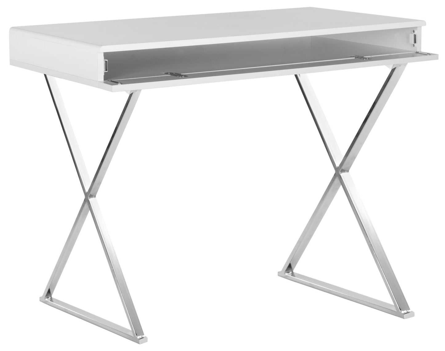 So simple, yet elegant and full of charm, the contemporary Gordon desk features x-shaped silver painted finish legs, white lacquered top, and a discreet pull-down compartment with ample room for storing a laptop, Ntebooks and other writing essentials.