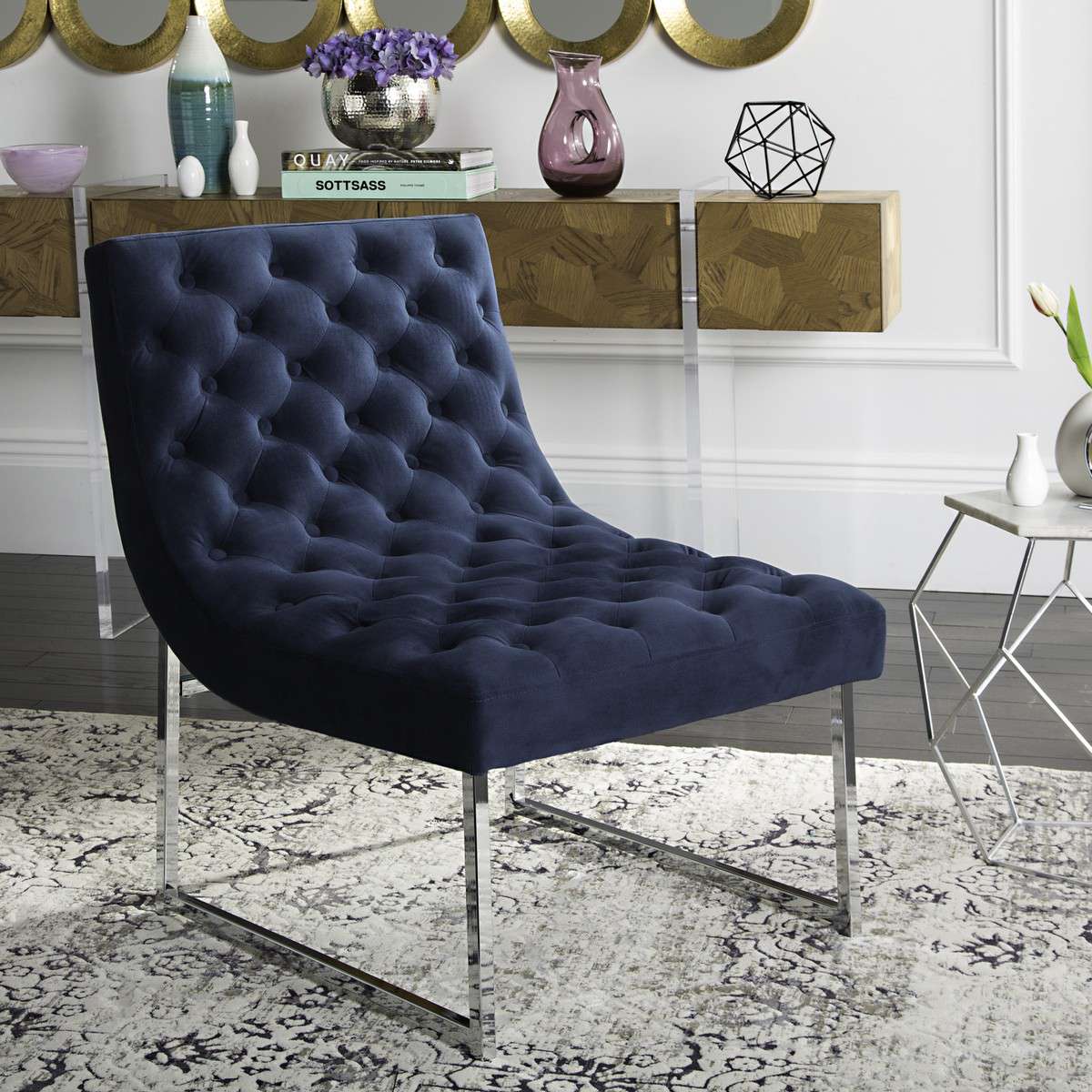 Designed for the lifestyle of the contemporary jetsetter, this velvet tufted sofa chair brings modern luxury to the cosmopolitan residence. The sleek angles of polished silver metal legs are paired with plush upholstery in a sumptuous navy hue.