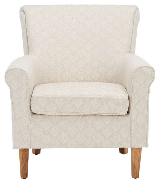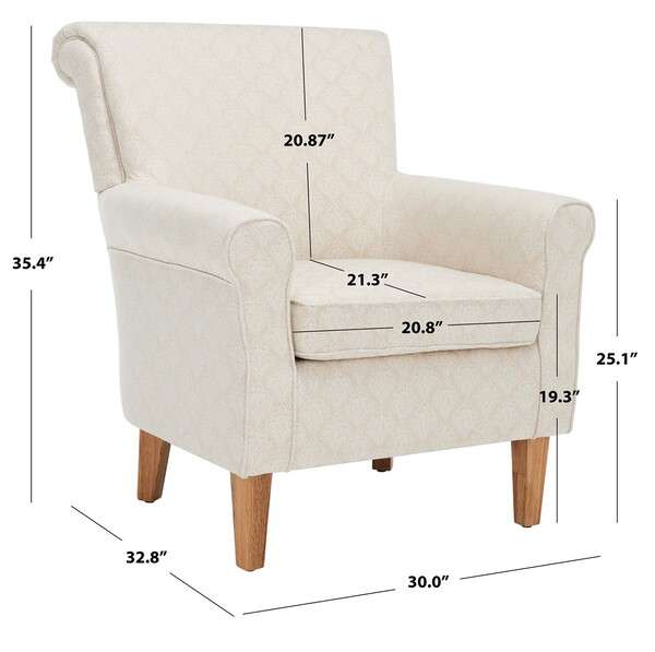 The classic roll arm of the Hazina Club Chair gets updated thanks to a fresh interpretation of a timeless beige damask pattern in a luxurious blend of linen and viscose. Standing atop espresso-finished legs, Hazina is glorious in the living room, family room, or master suite.